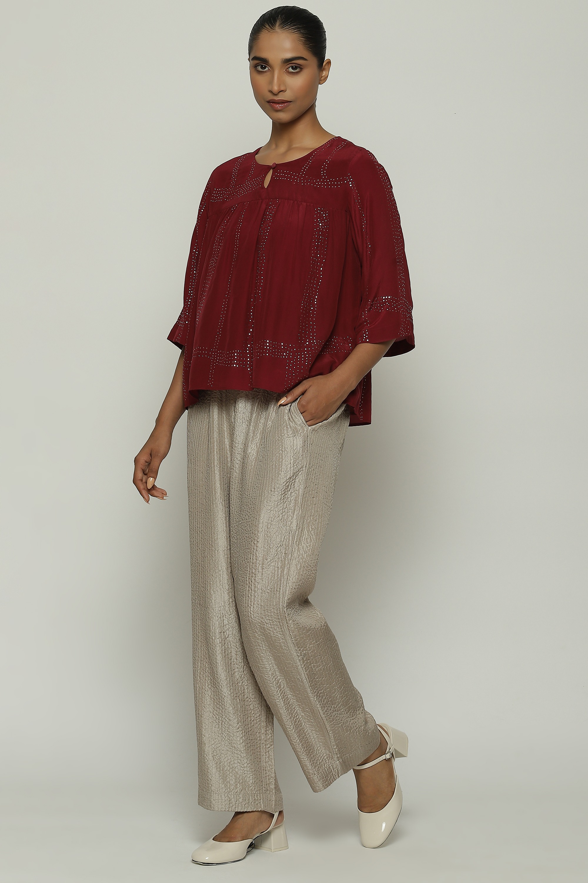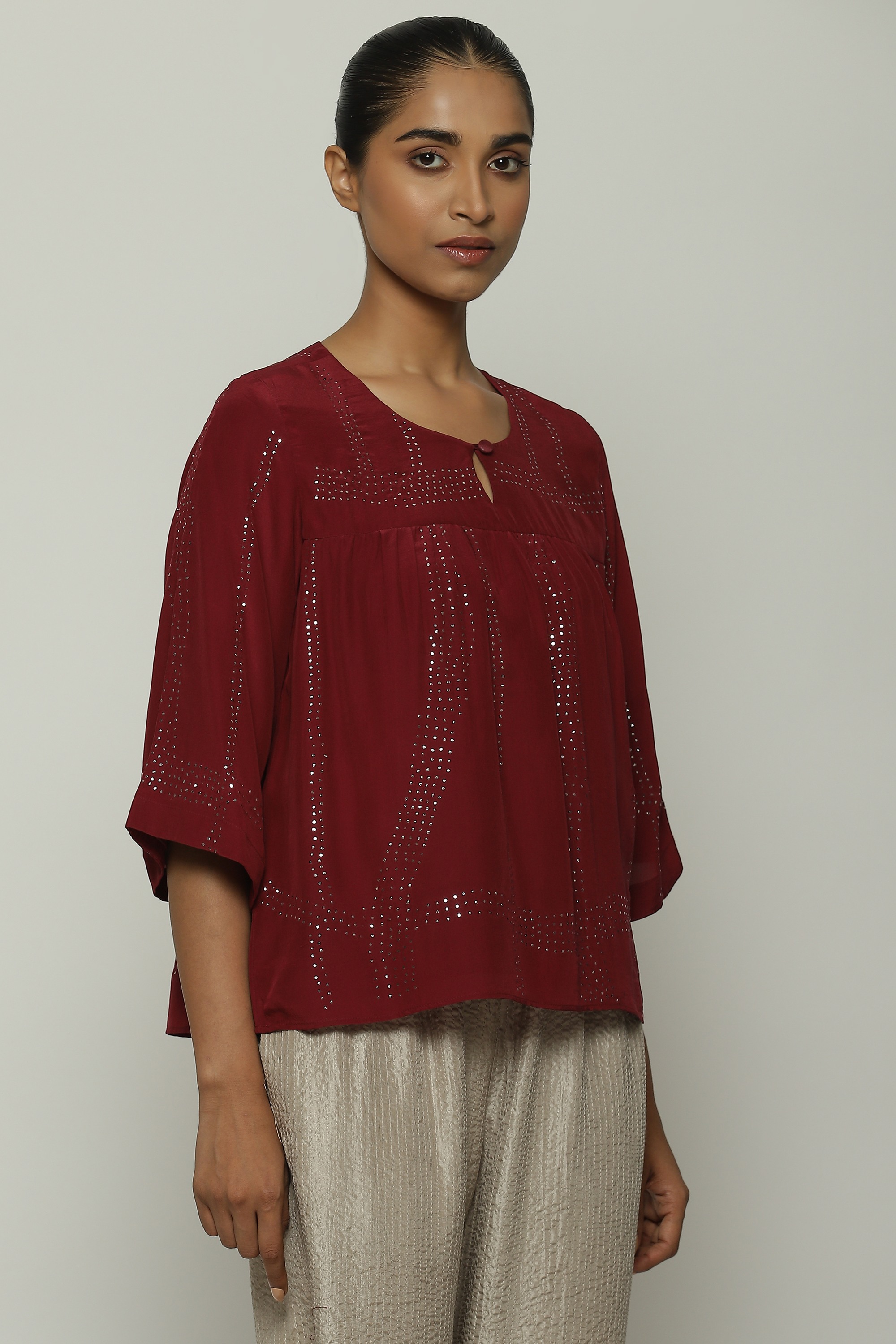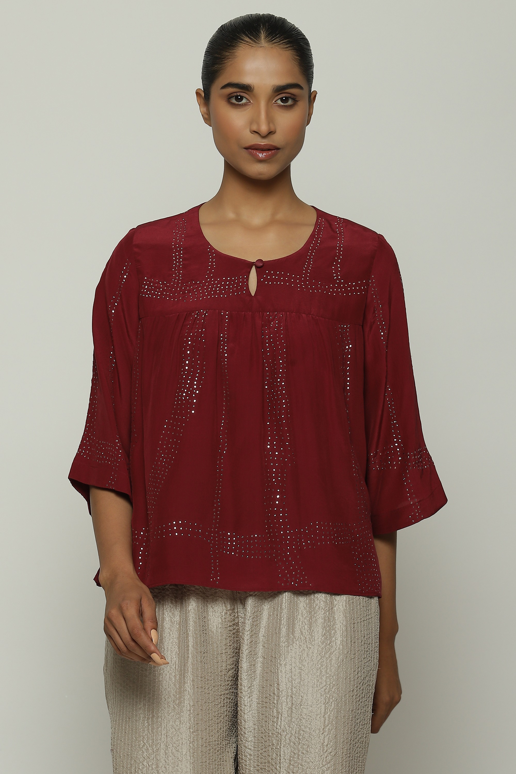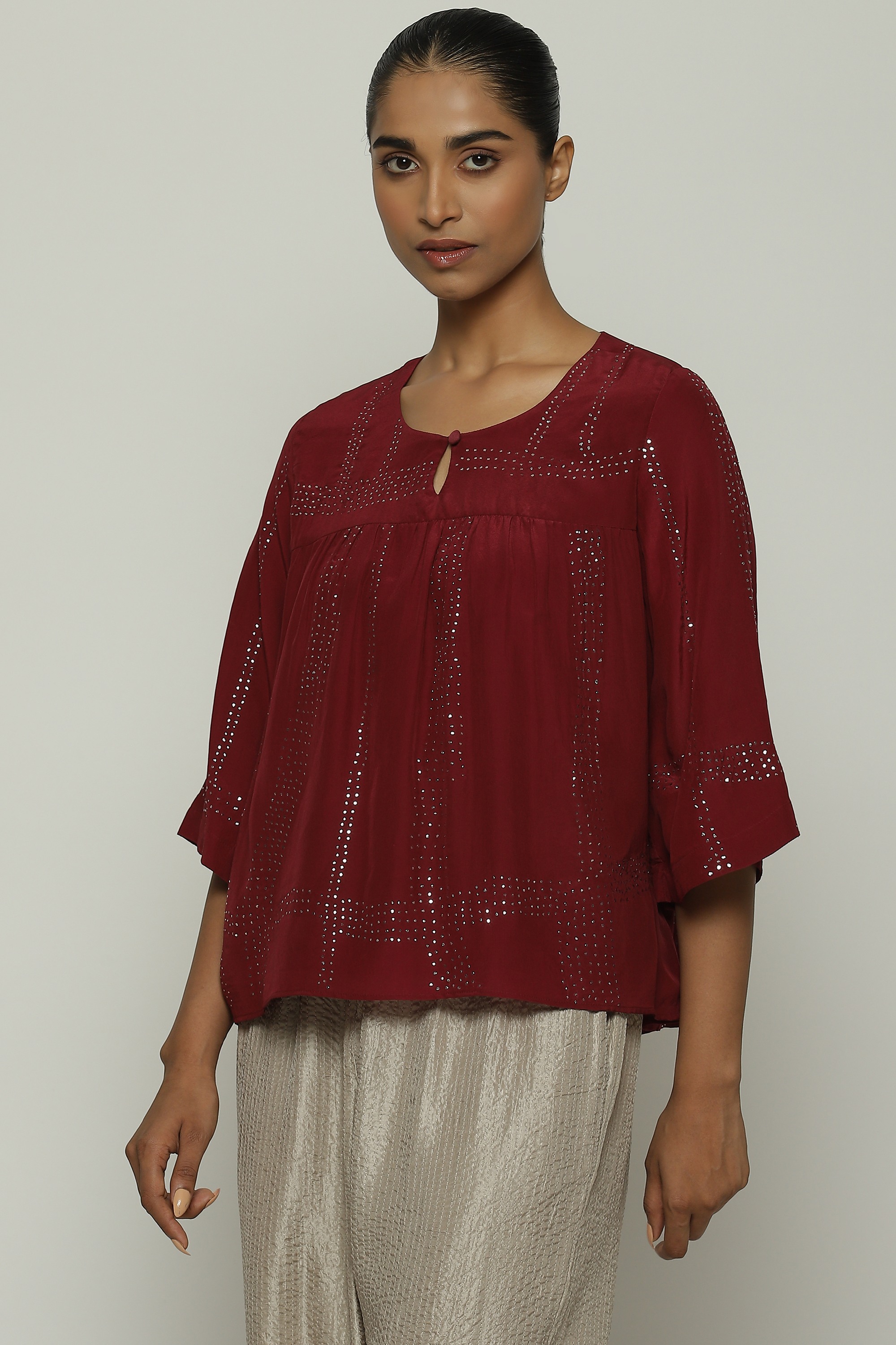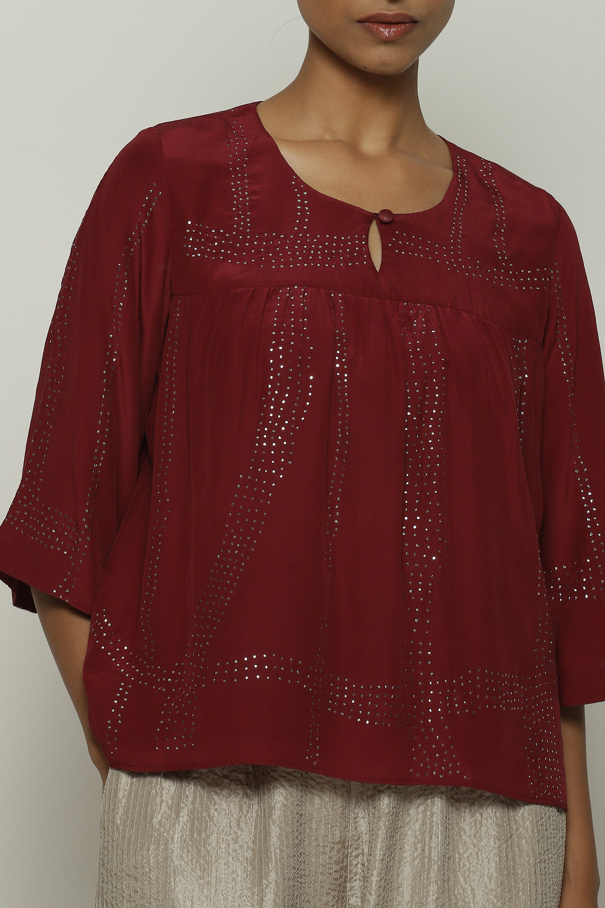An elegant top crafted in a buttery crepe de chine, featuring tribal checks.