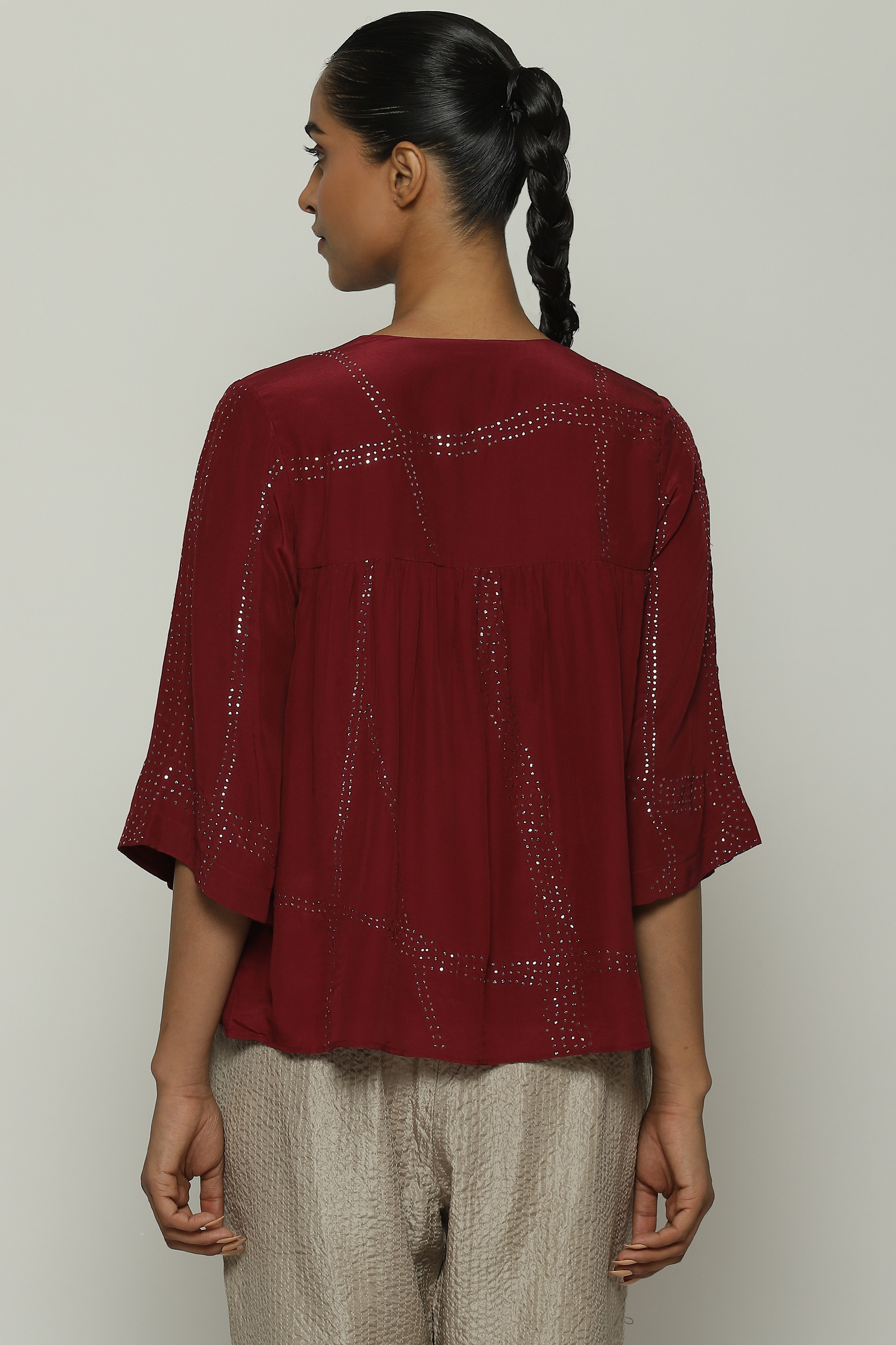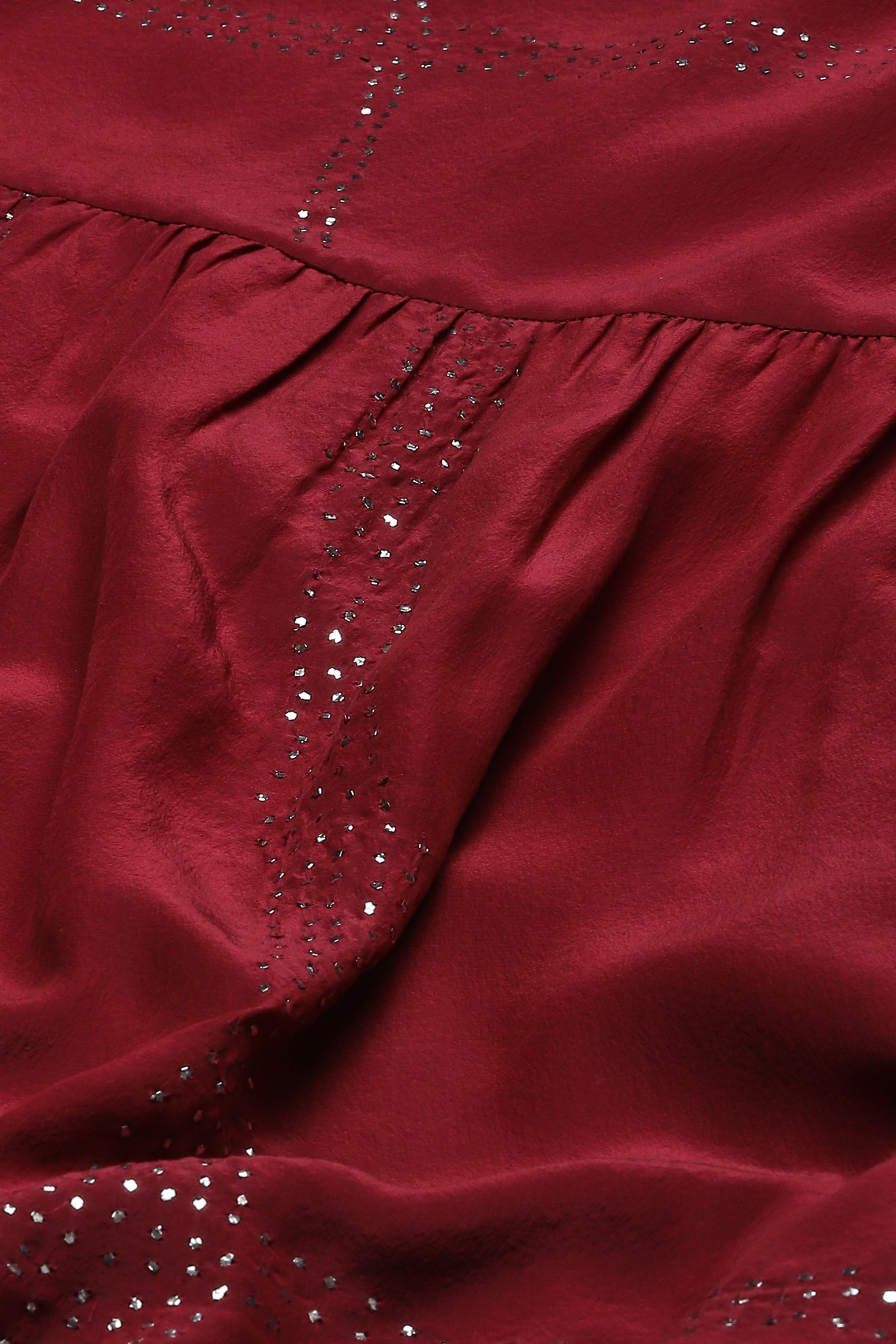 This fabric is a lightweight cloth made with twisted silk yarns. The fluid drape is complemented with Mukaish, which is a traditional metallic embroidery. This gives the creation a striking, tribal pattern.