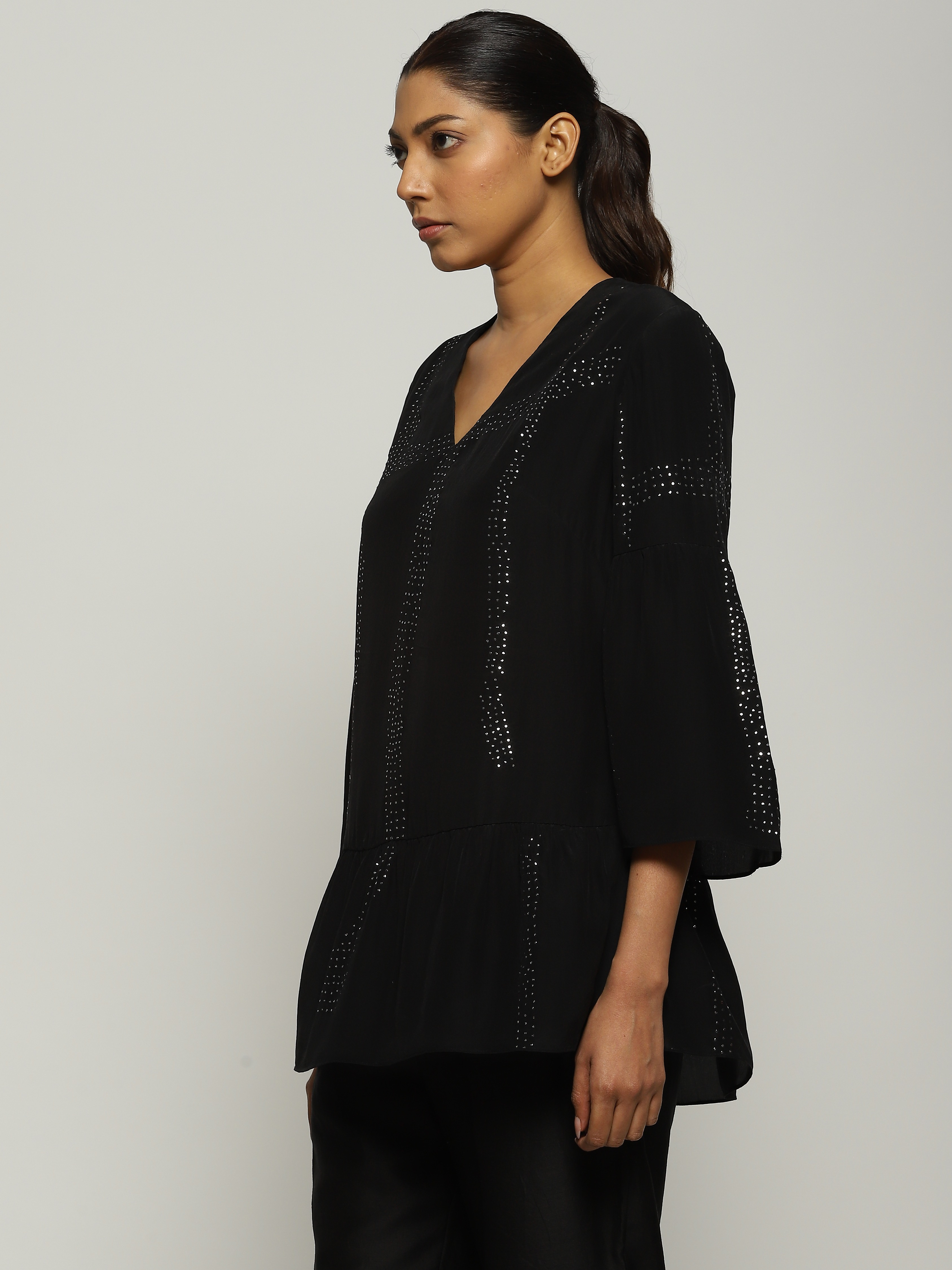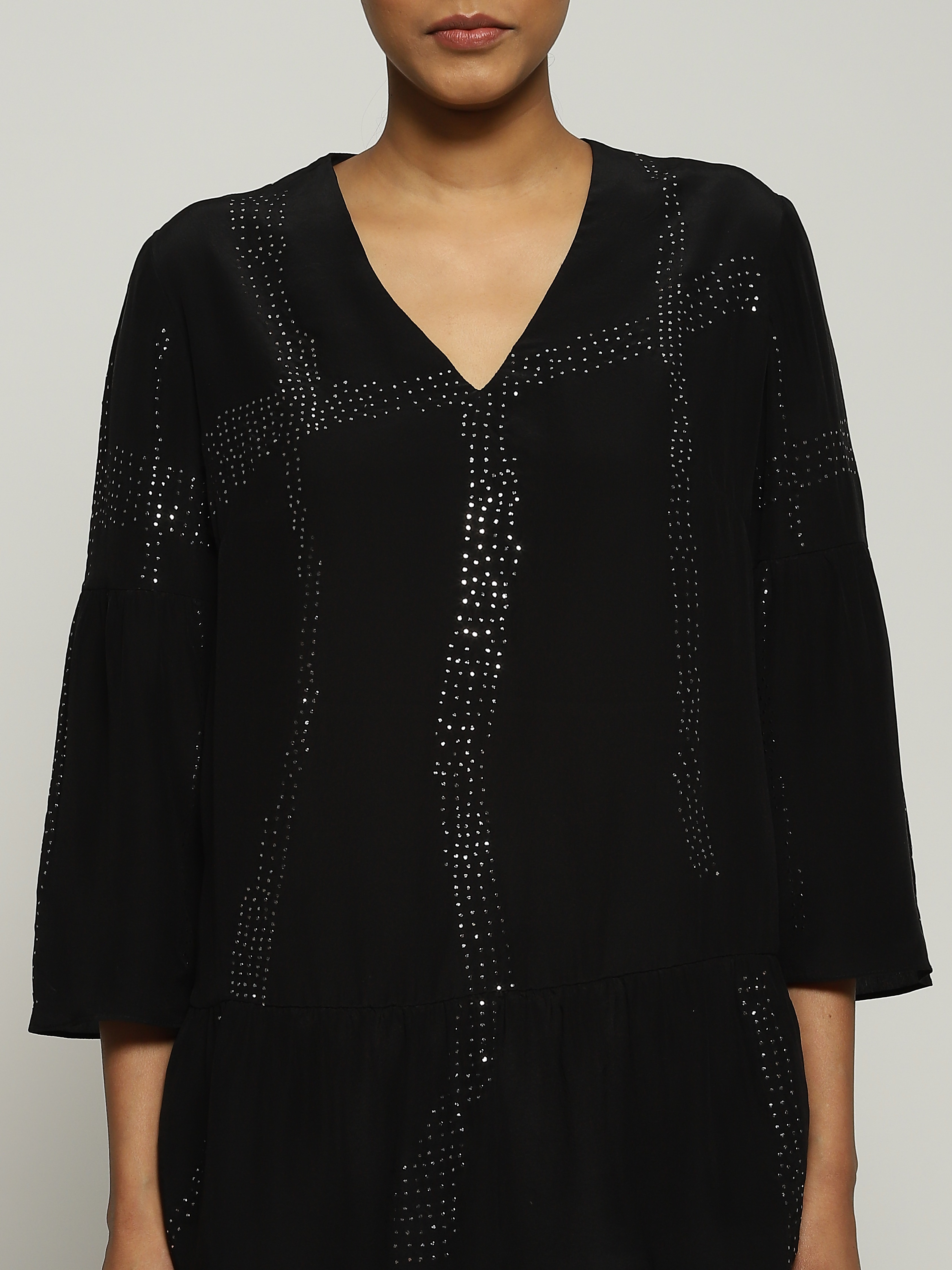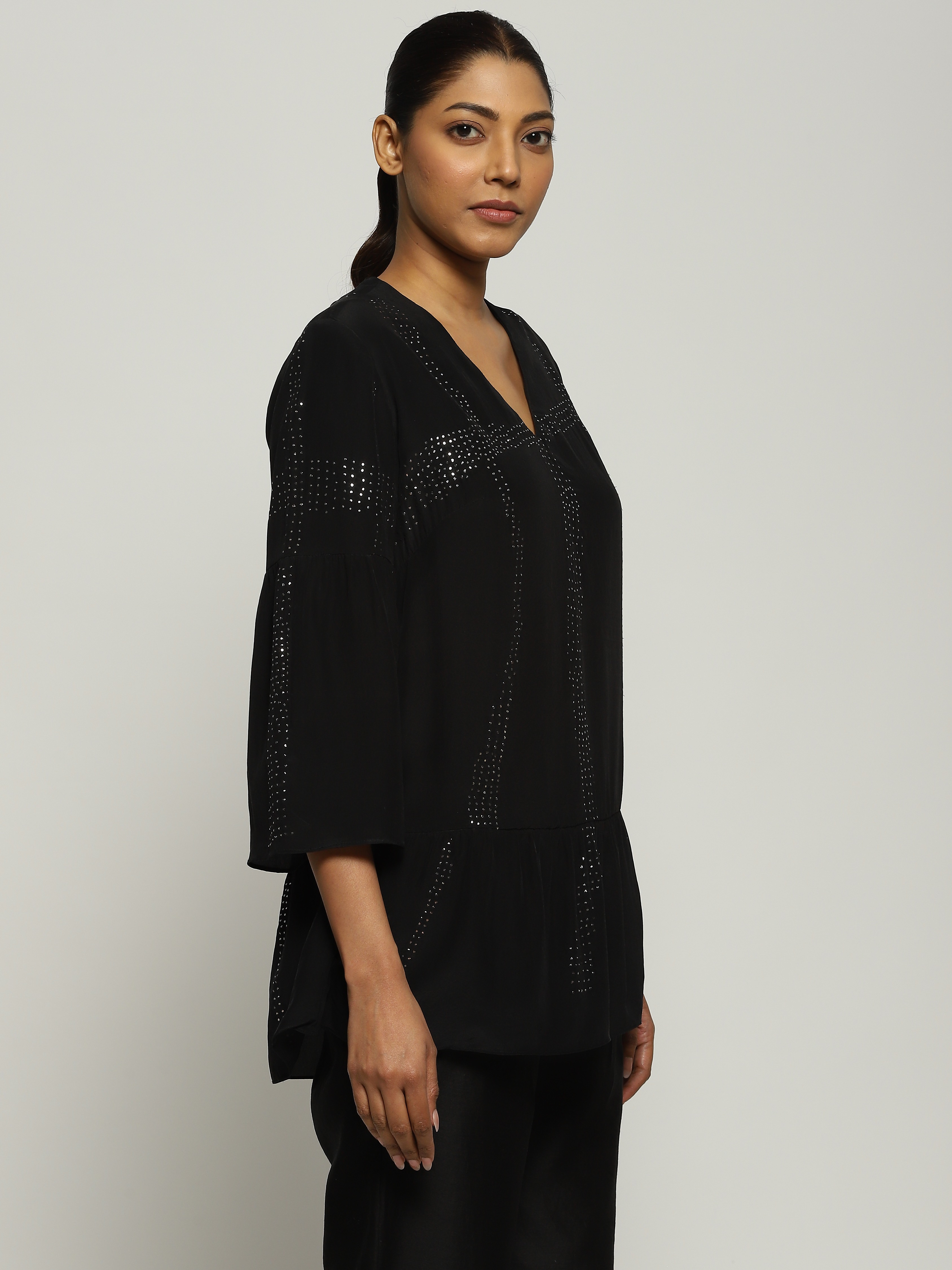 A black tunic featuring tribal checks.