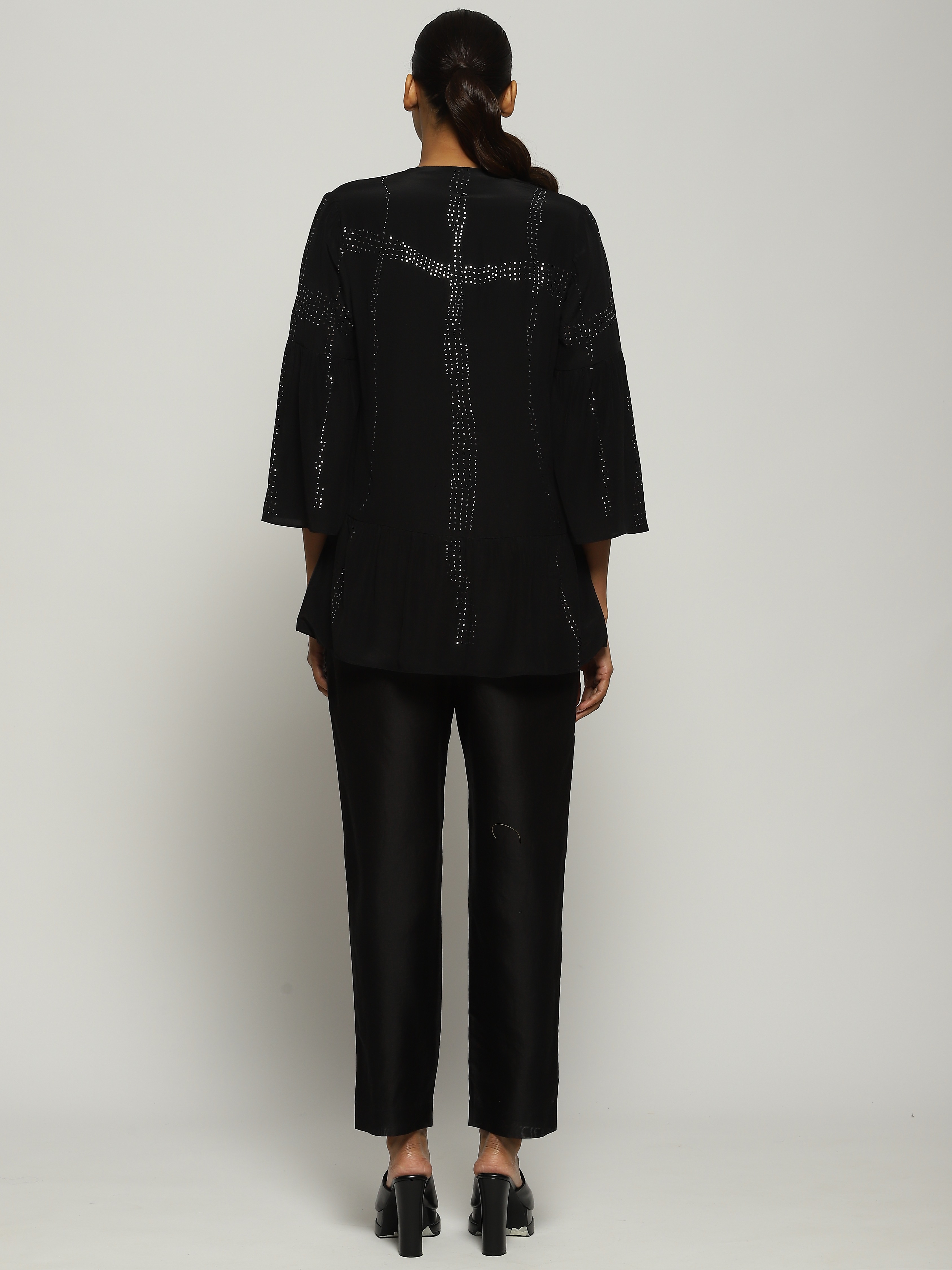Embellishment Description : The garment has been hand embellished by passing the metallic strip through the fabric and then hammering it down to secure it.