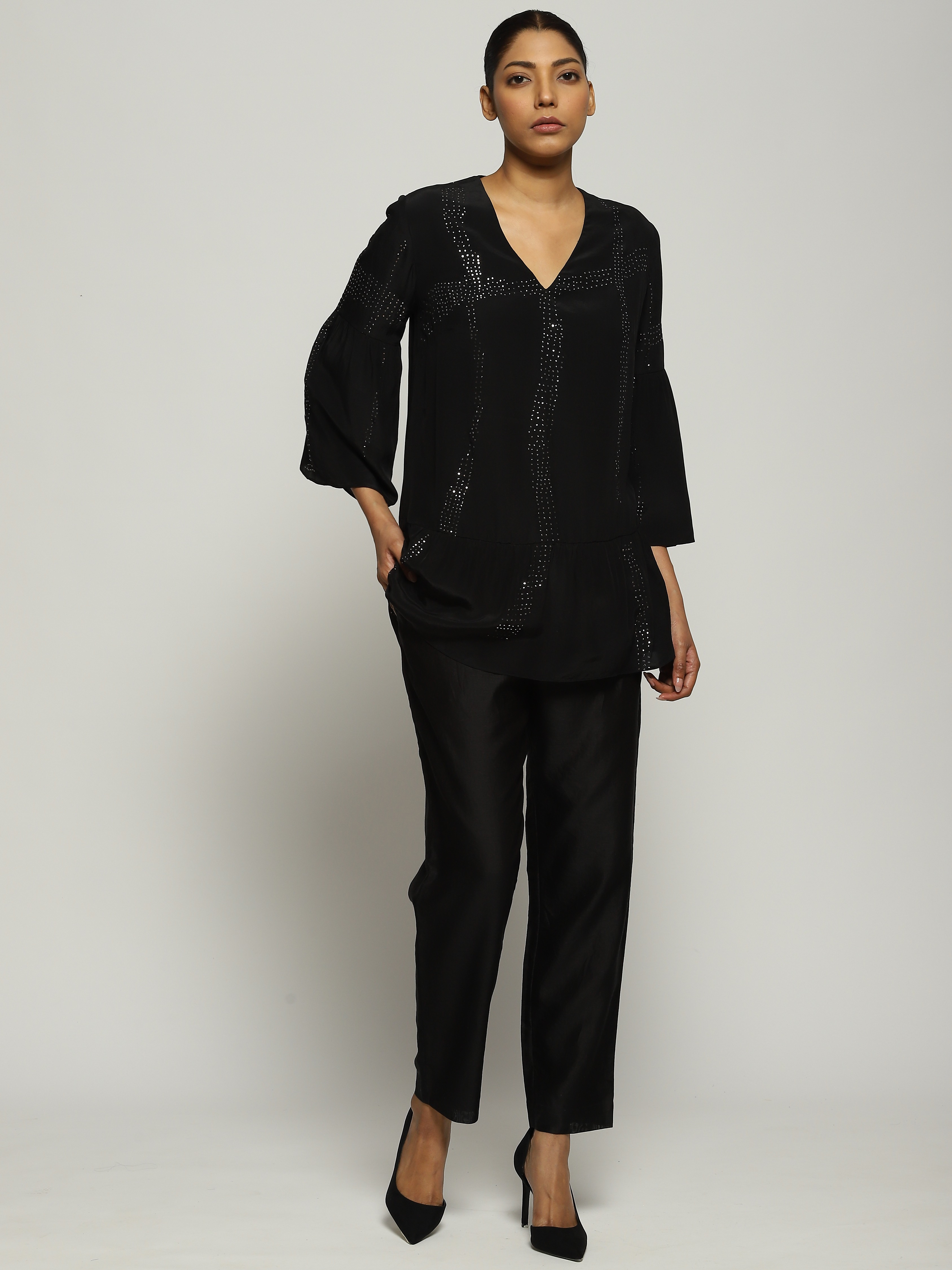 Crafted in a buttery crepe de chine, the piece features delicate metallic embroidery that is brought forth using the art of Mukaish work.
