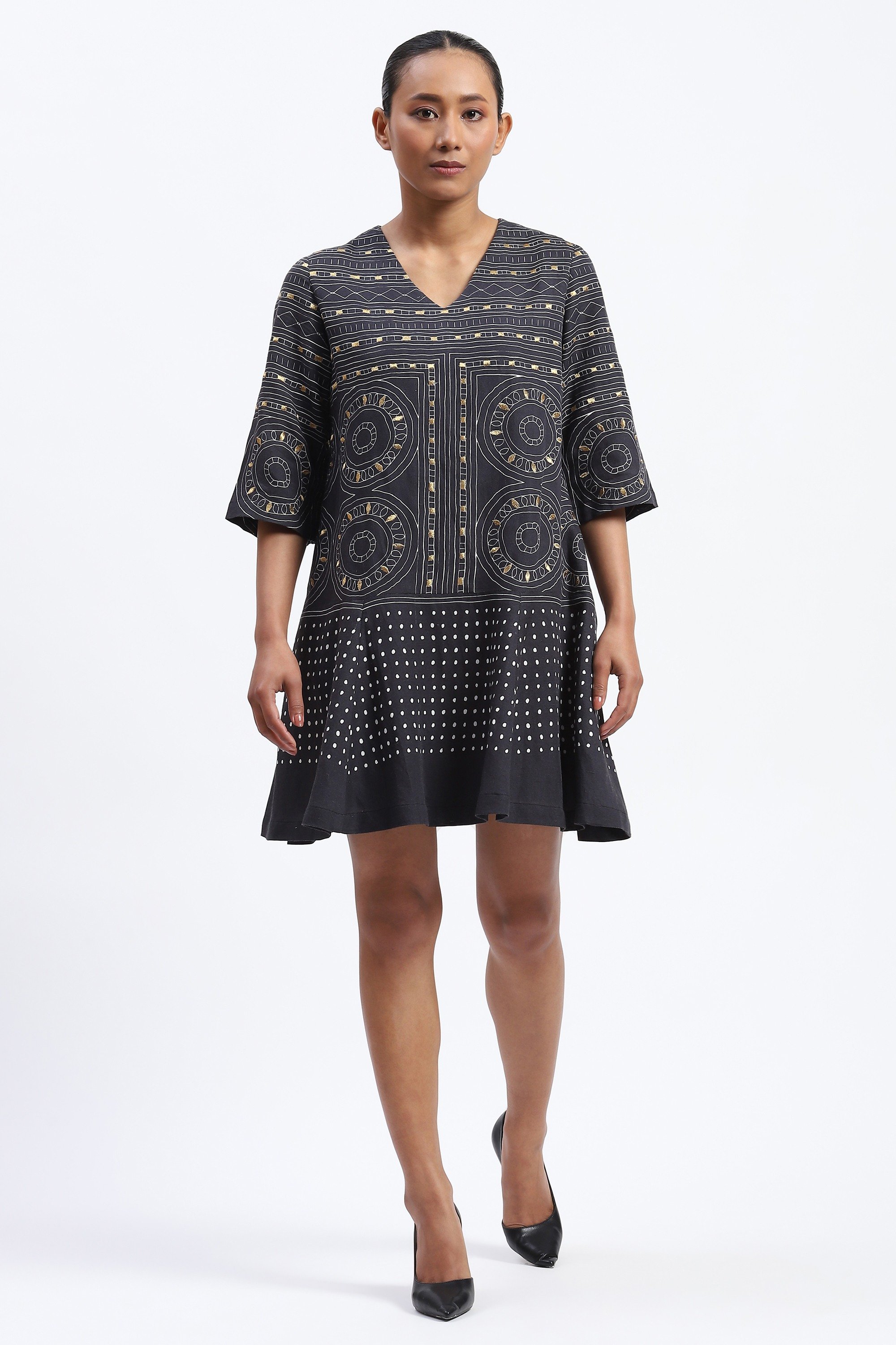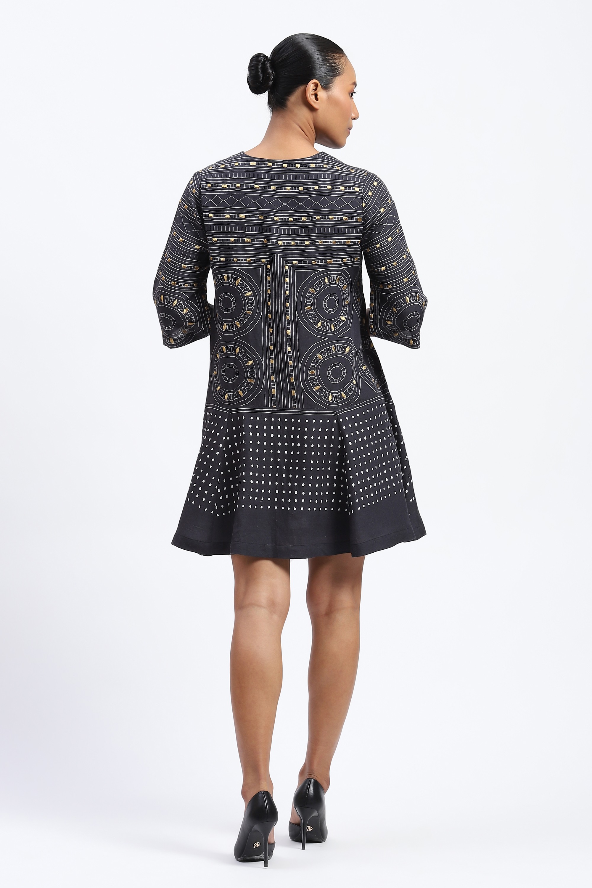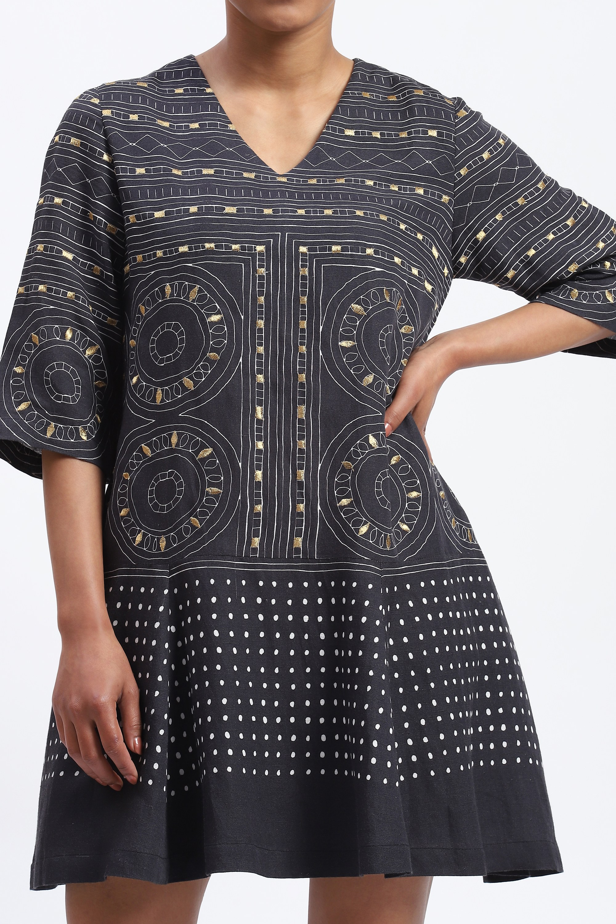 This limited edition piece has been made using a tribal inspired geometric print that is highlighted with metallic gold embroidery.