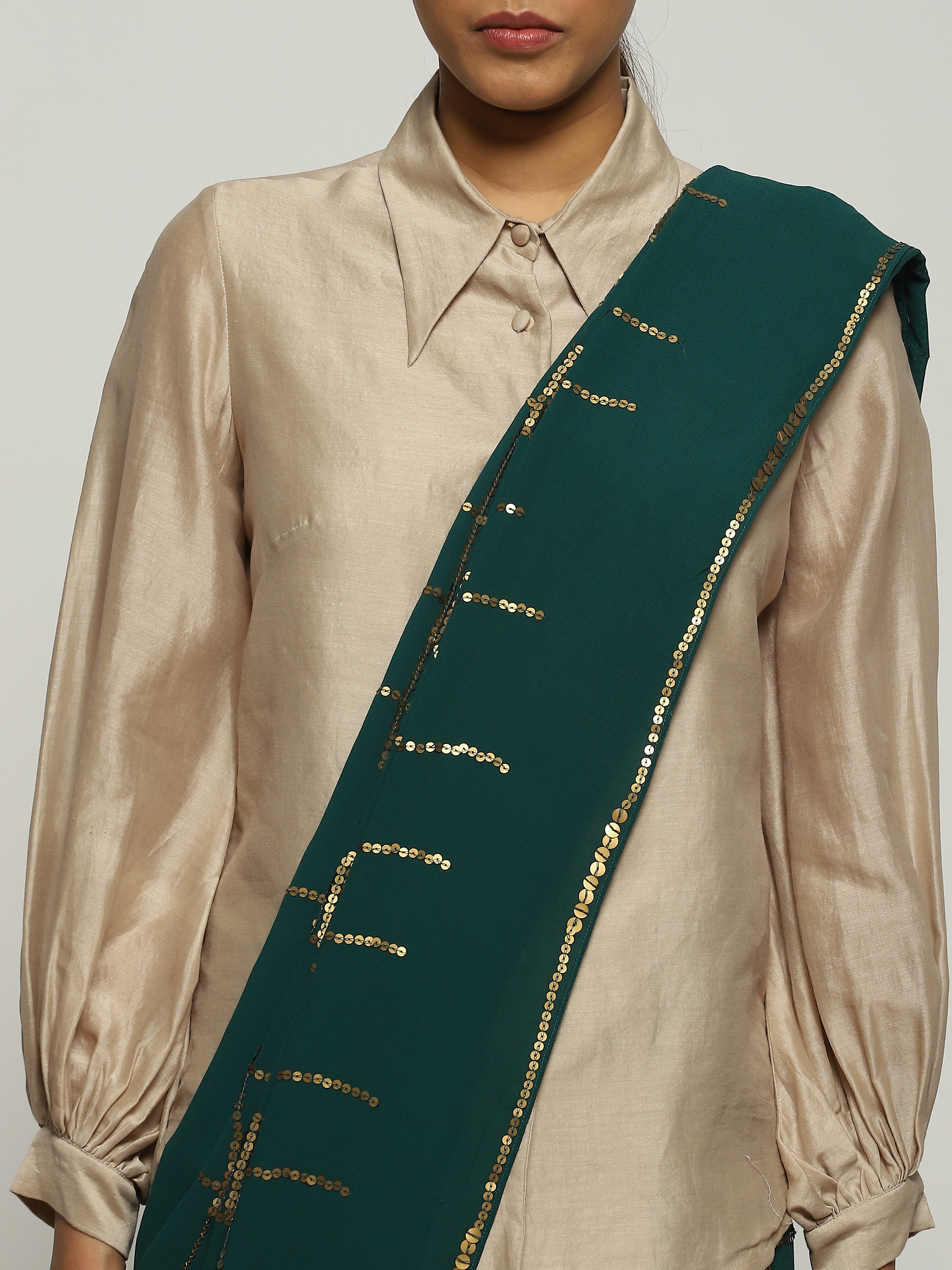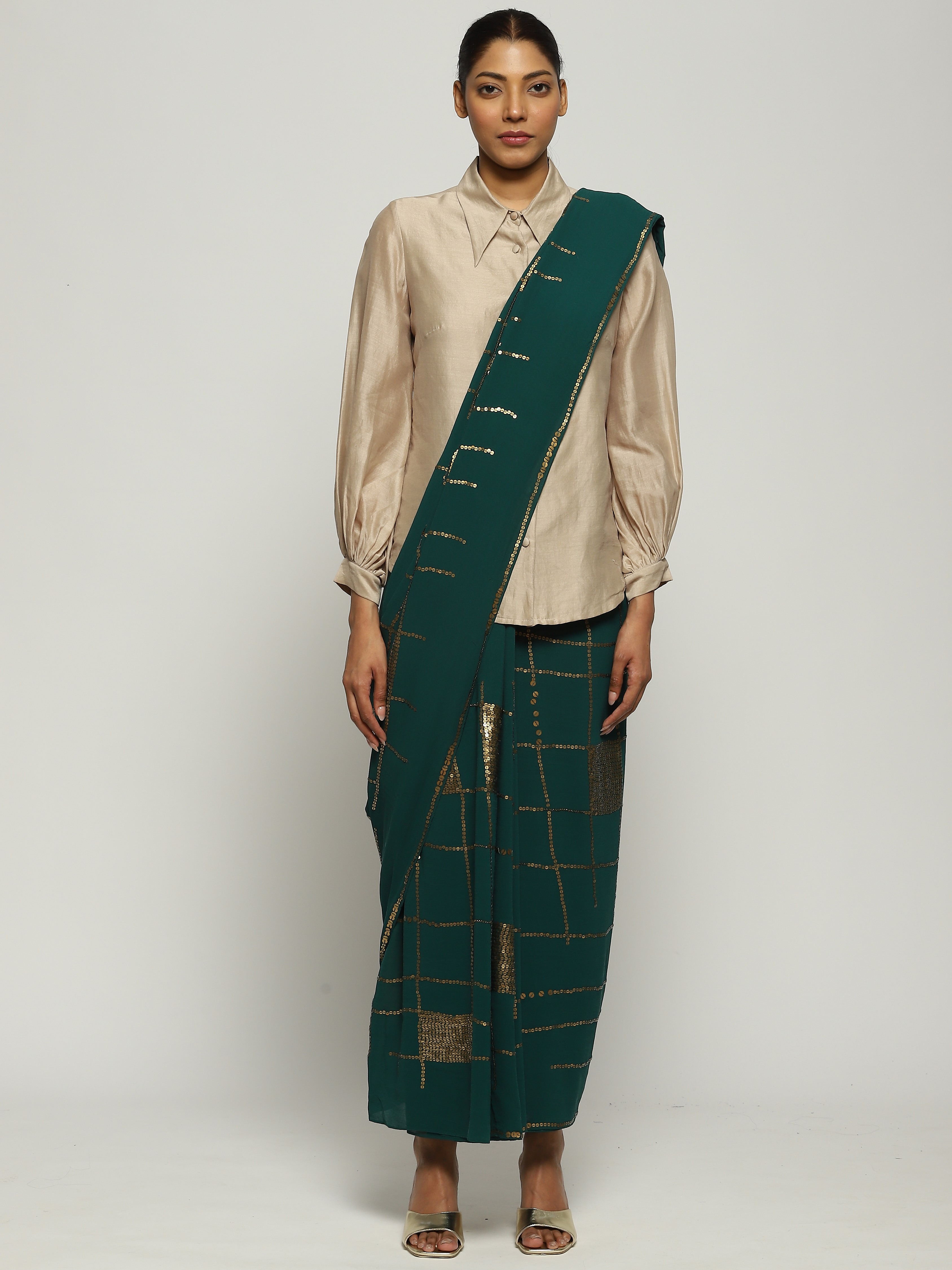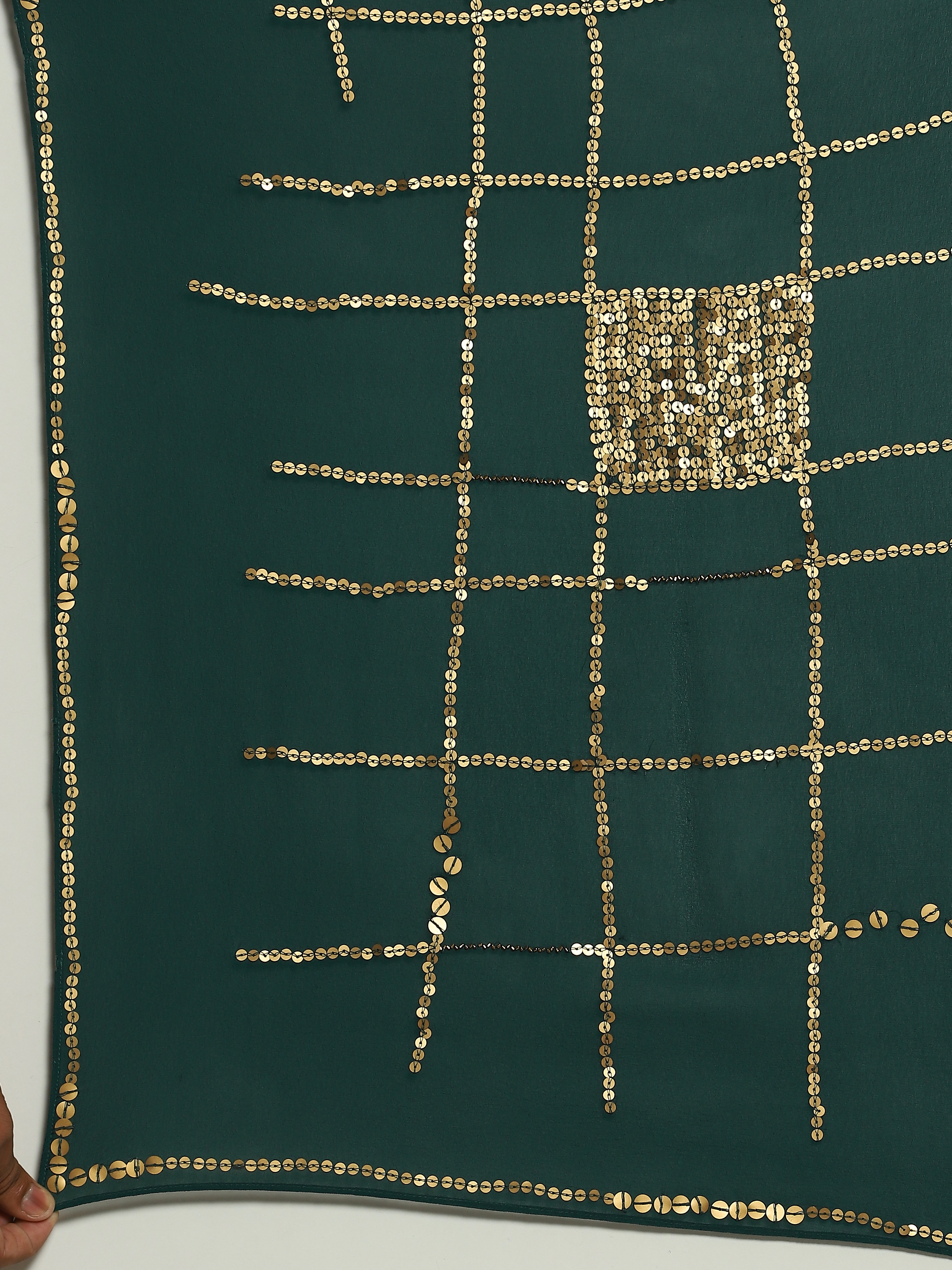 Crafted in semi-sheer Georgette silk, this saree is embroidered with gold sequins using the Hand Adda technique.