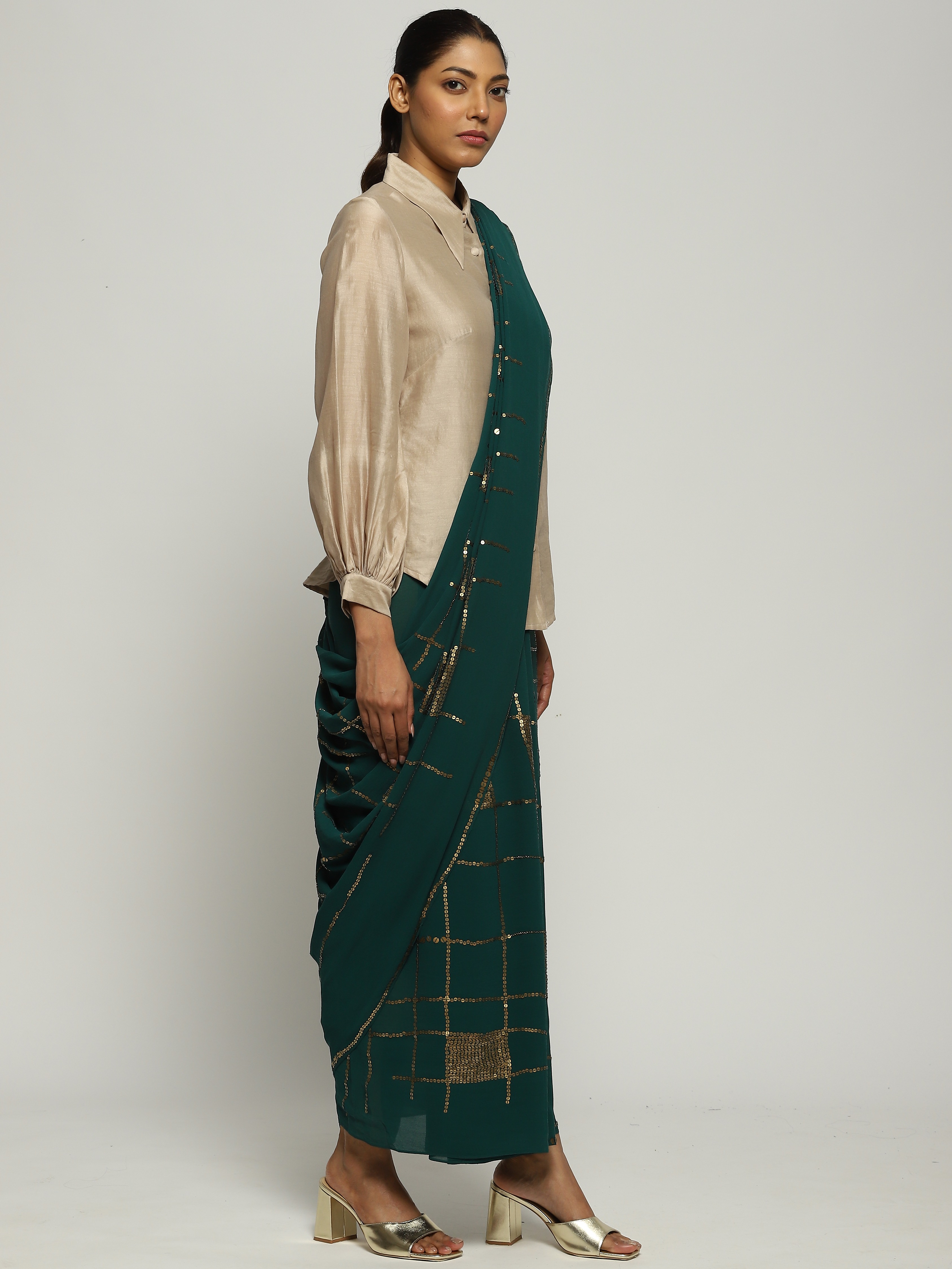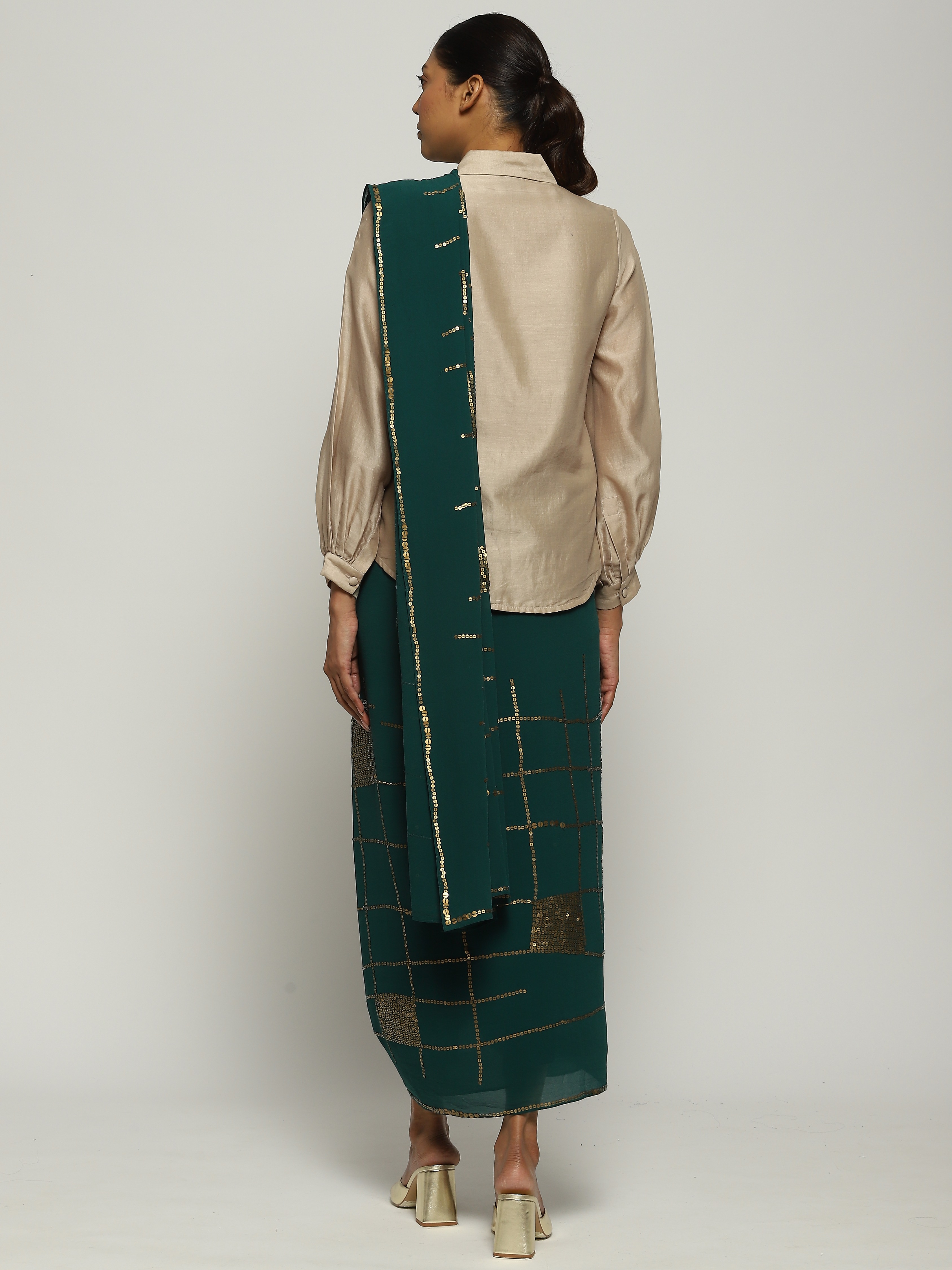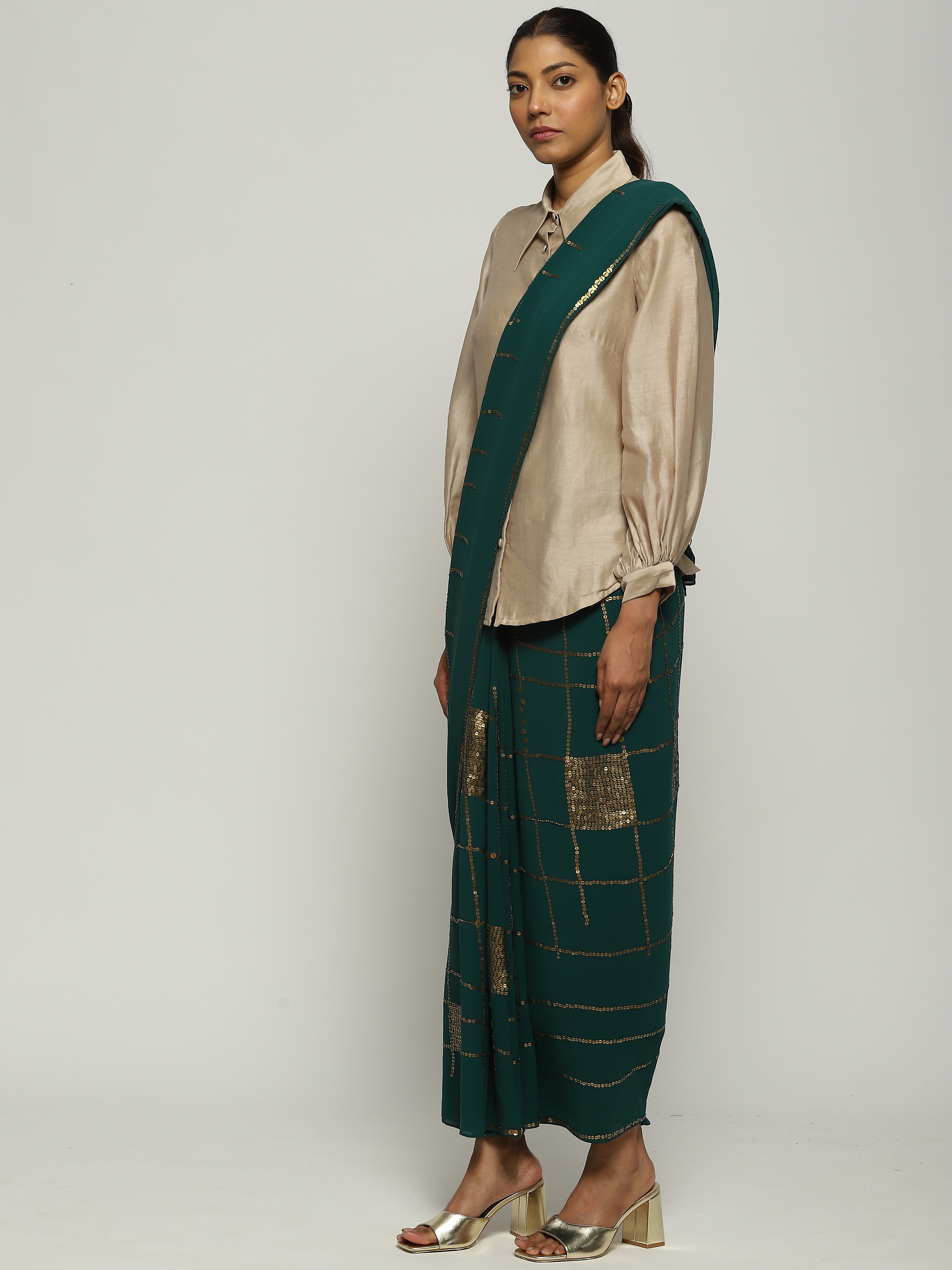 Crafted in semi-sheer Georgette silk, this saree is embroidered with gold sequins using the Hand Adda technique.