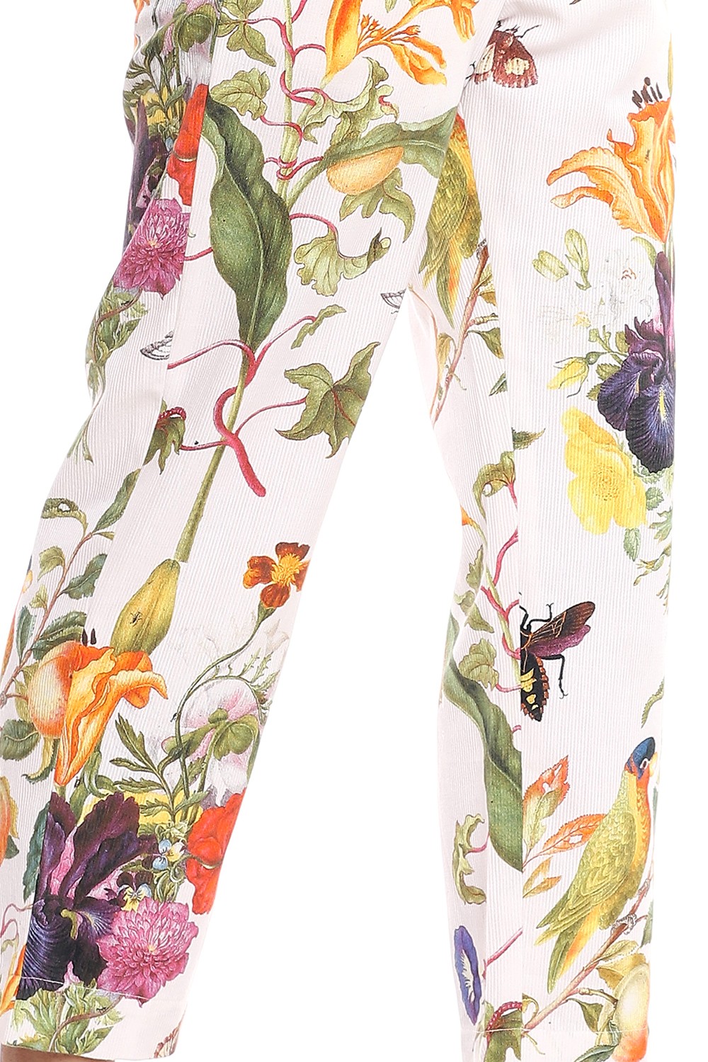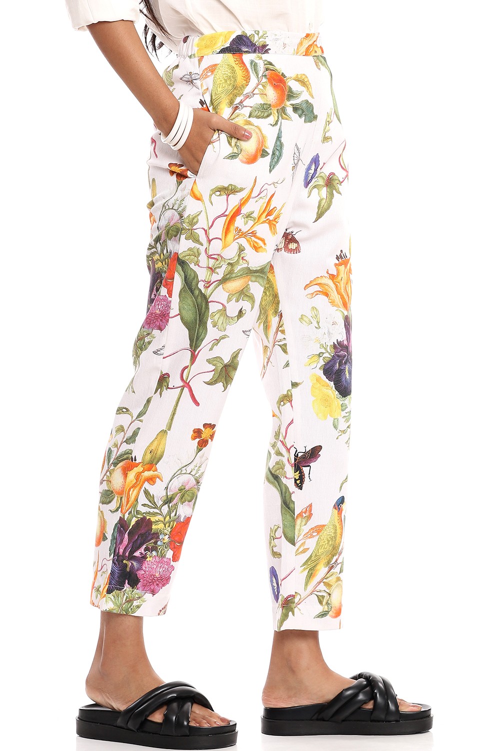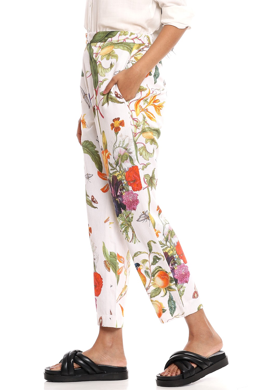 Add the dreamy tropical print straight cropped pants to your personal style, cut from bedford cord cotton fabric for all day comfort, multicolour flowers printed on a white ground. Pair them with a plain white shirt.