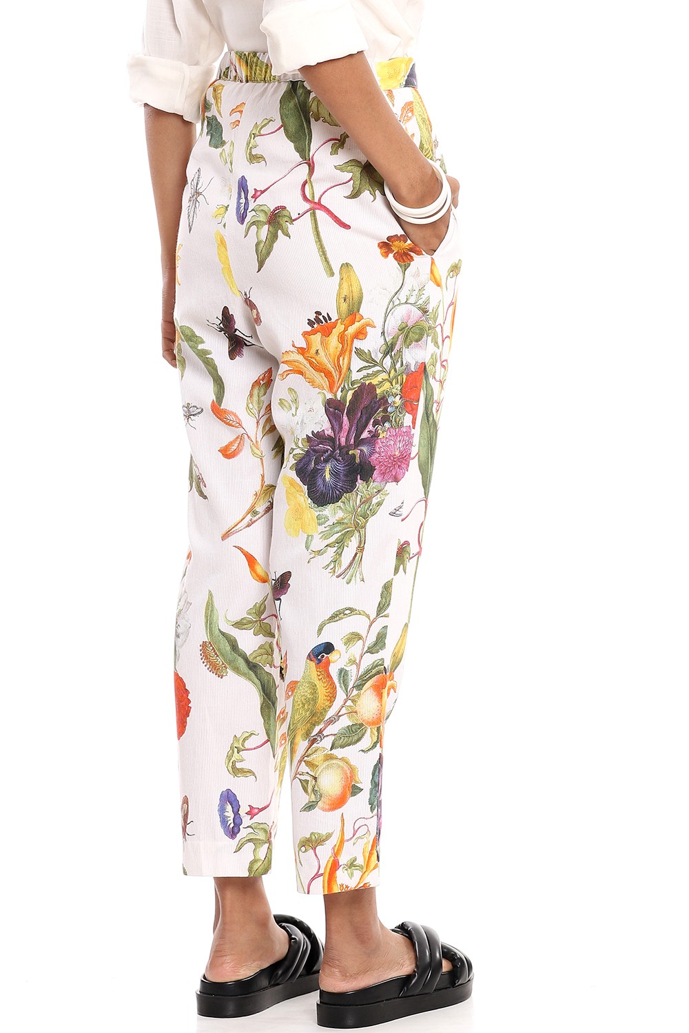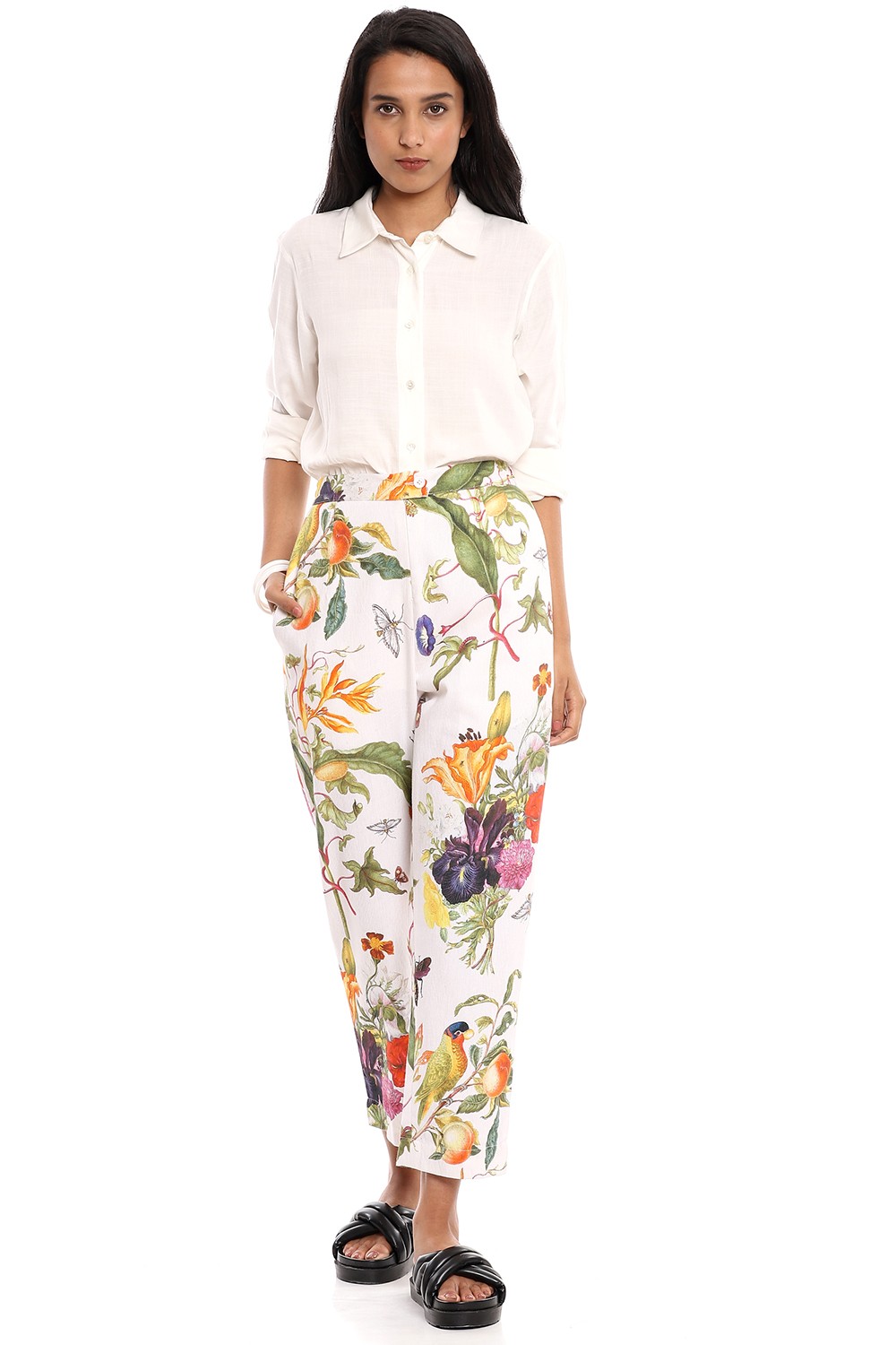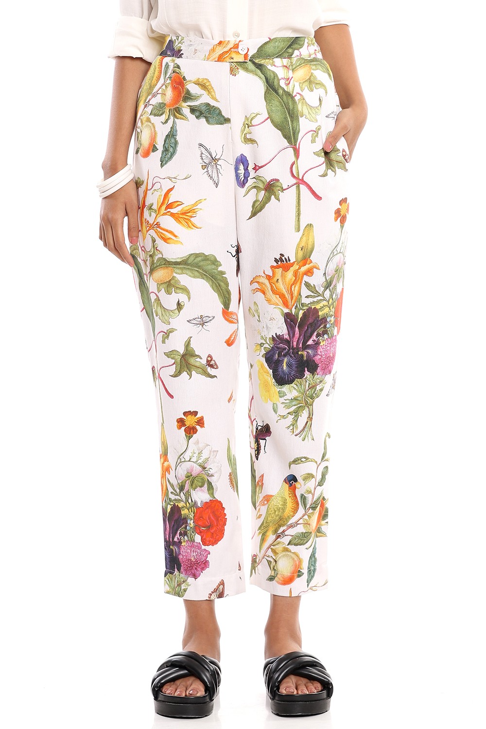 Add the dreamy tropical print straight cropped pants to your personal style, cut from bedford cord cotton fabric for all day comfort, multicolour flowers printed on a white ground. Pair them with a plain white shirt.