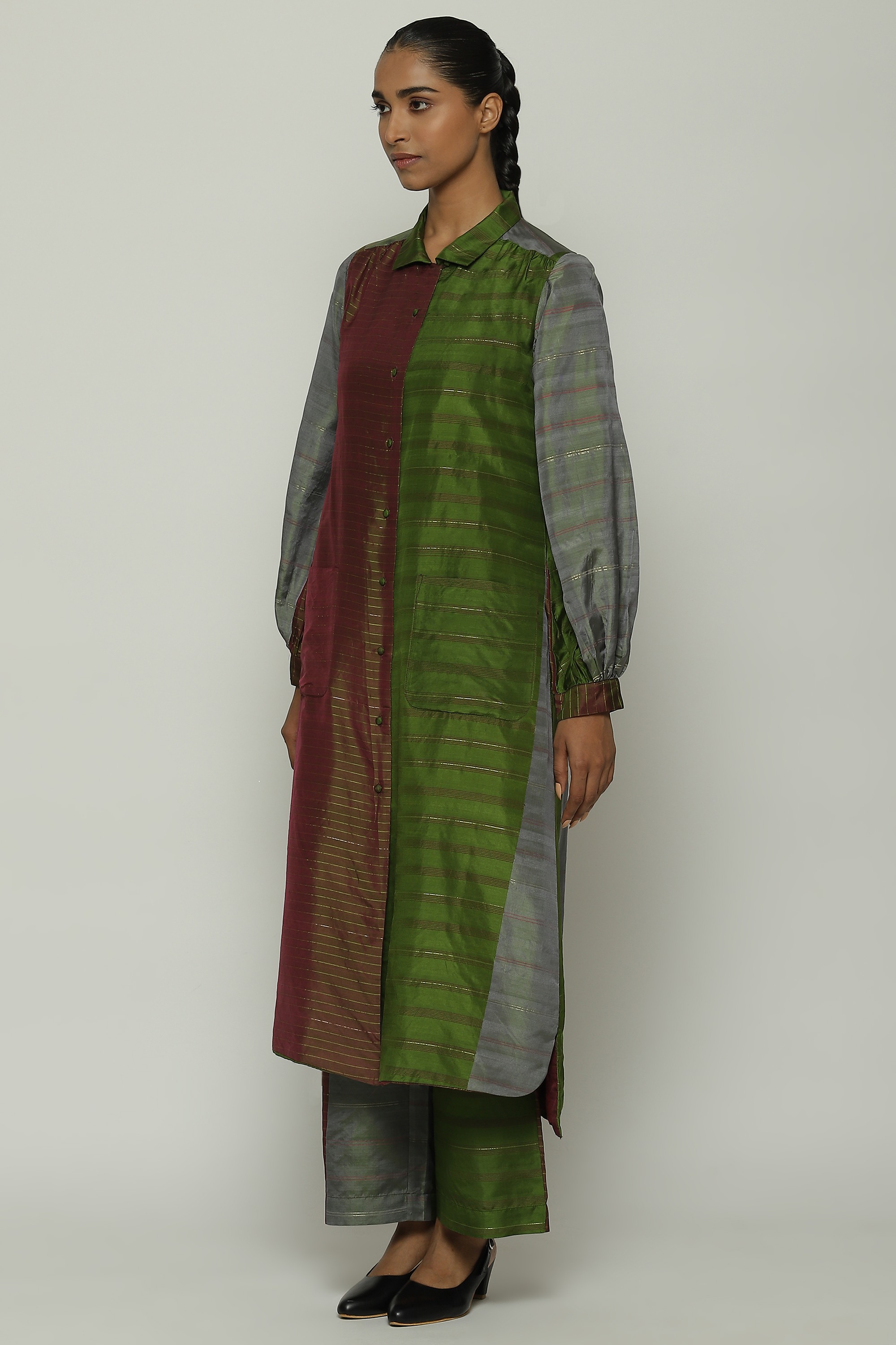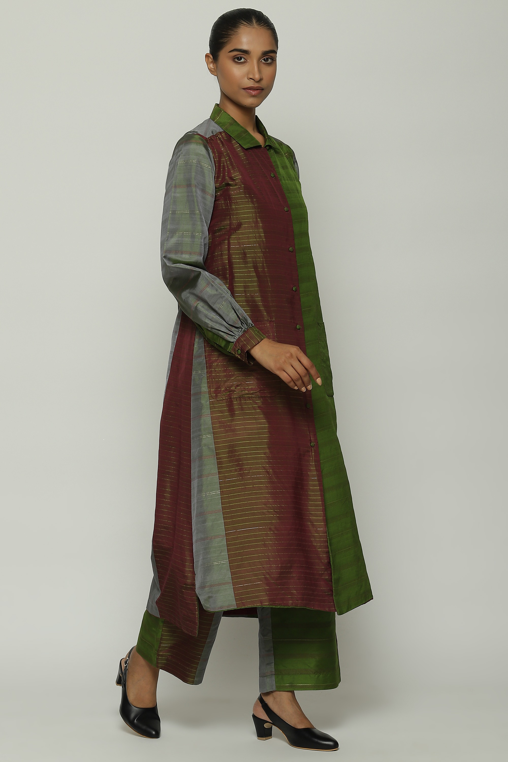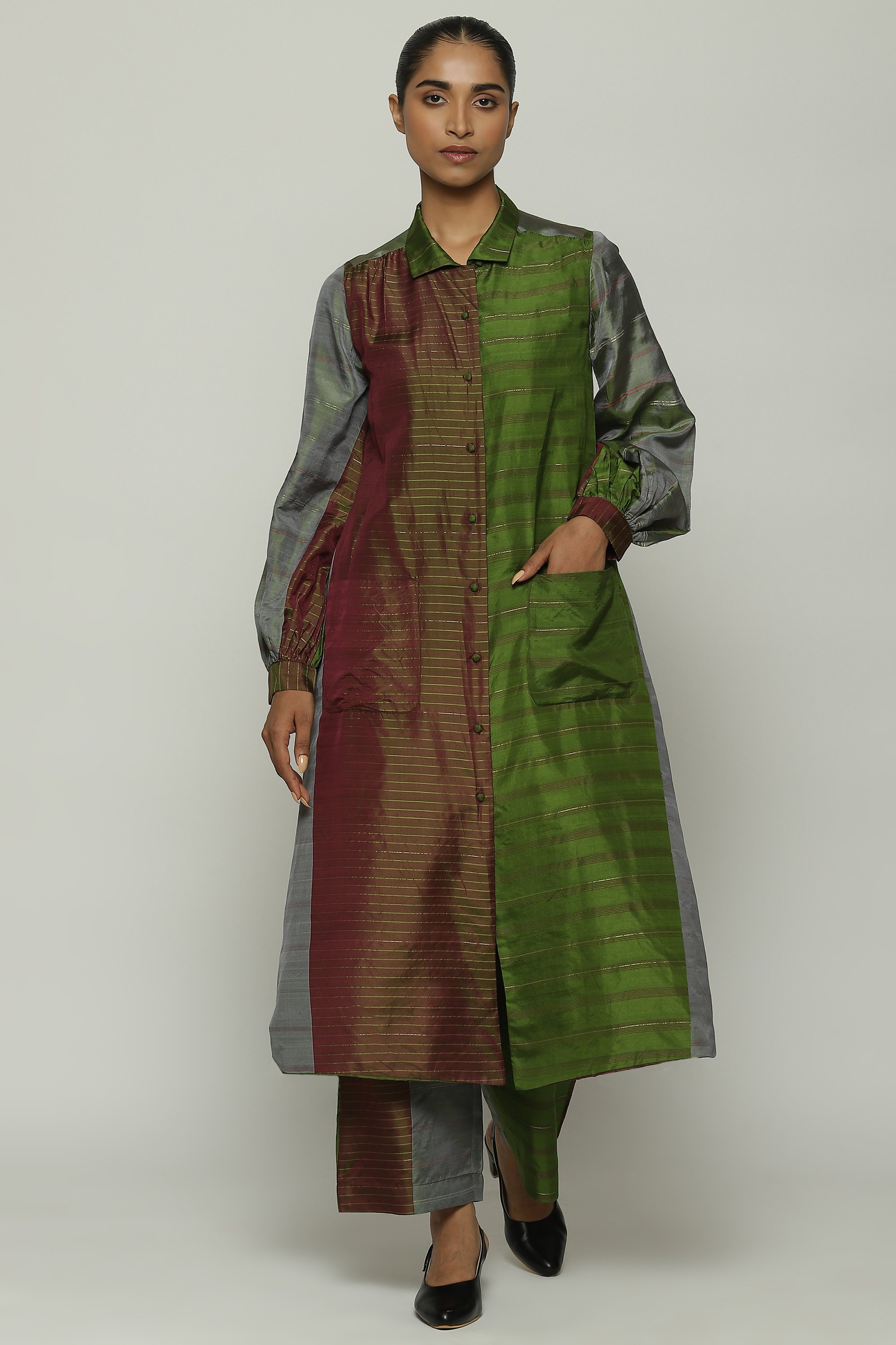 A long shirt in hues of amla and wine.
