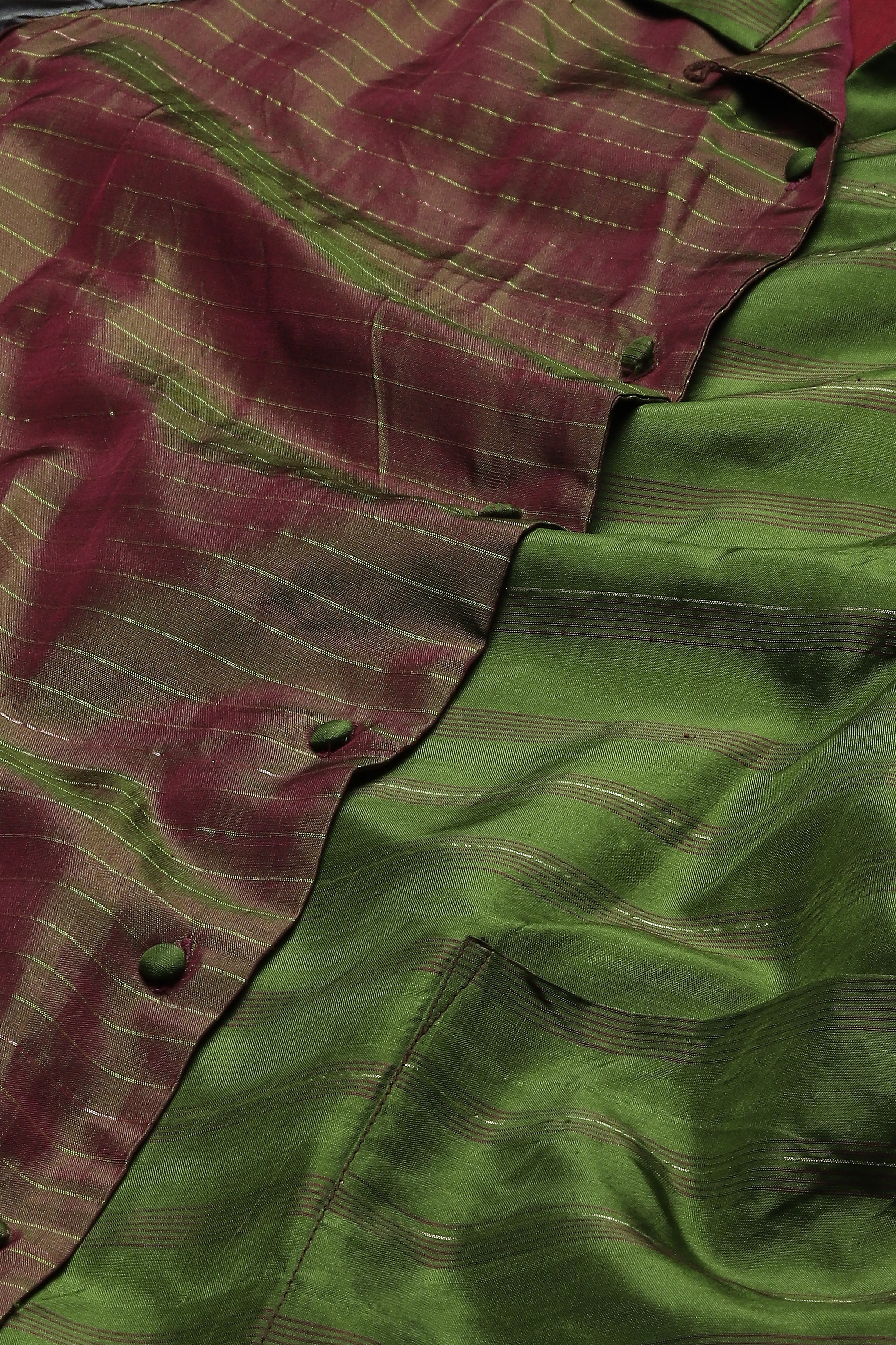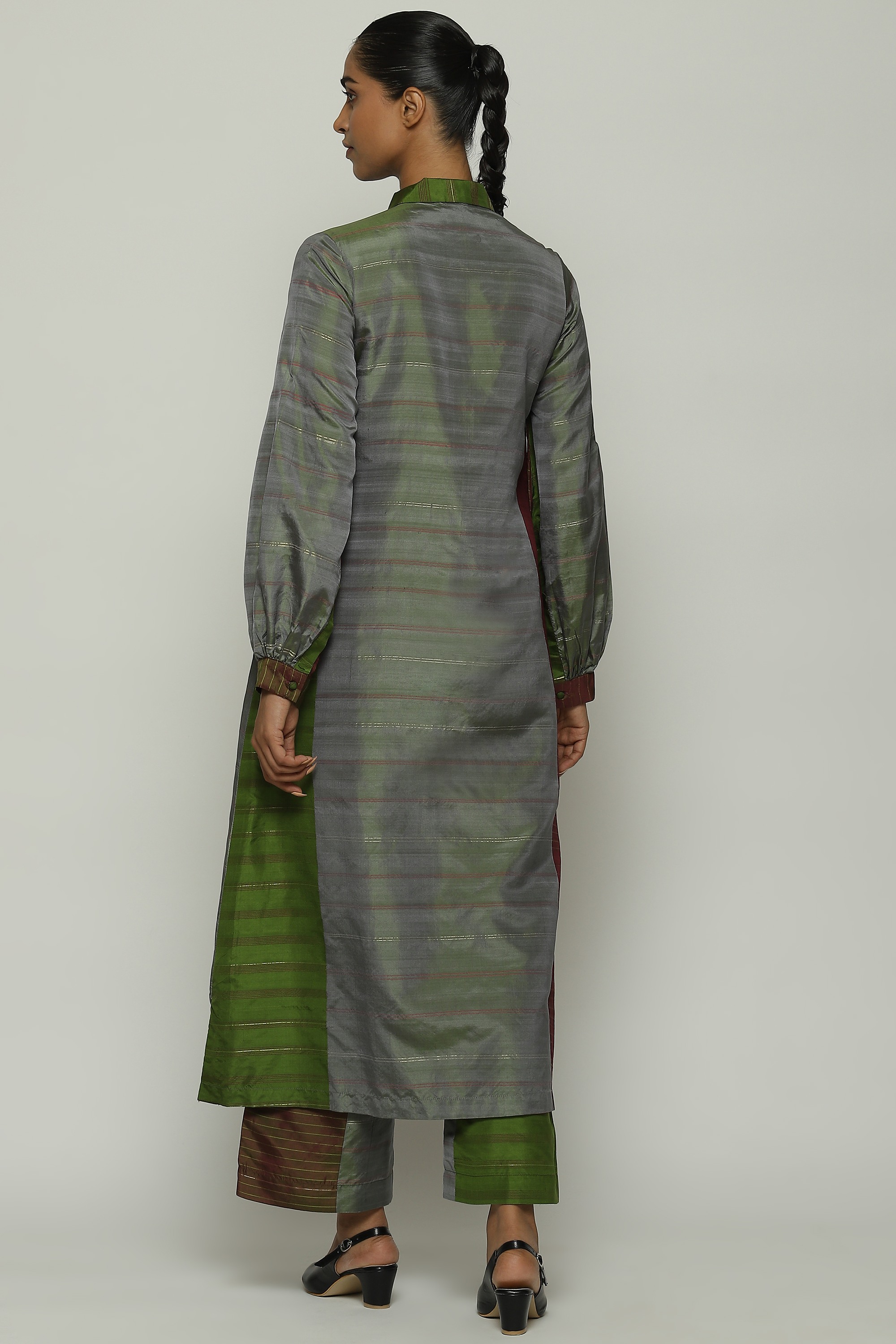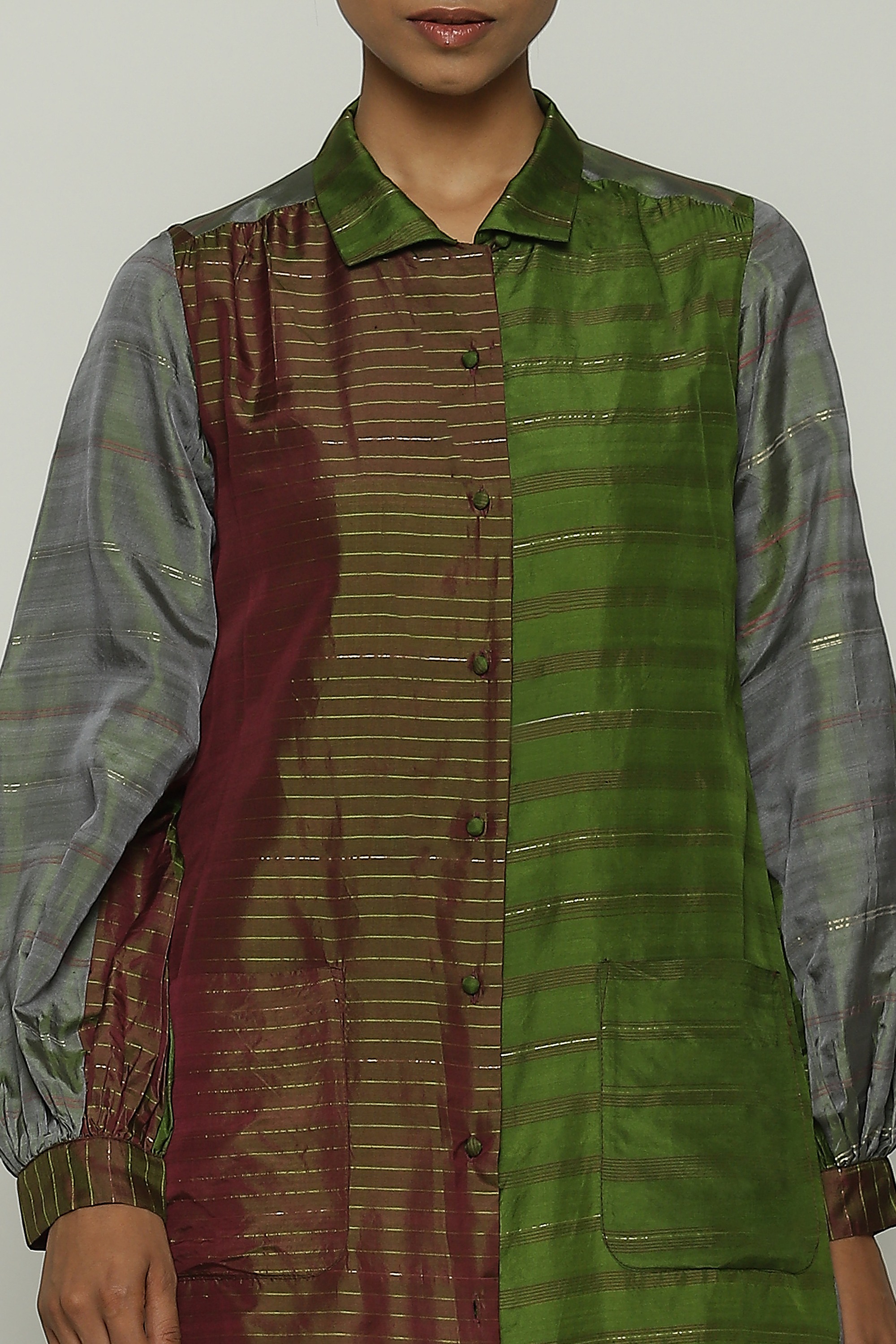 A long shirt in hues of amla and wine.