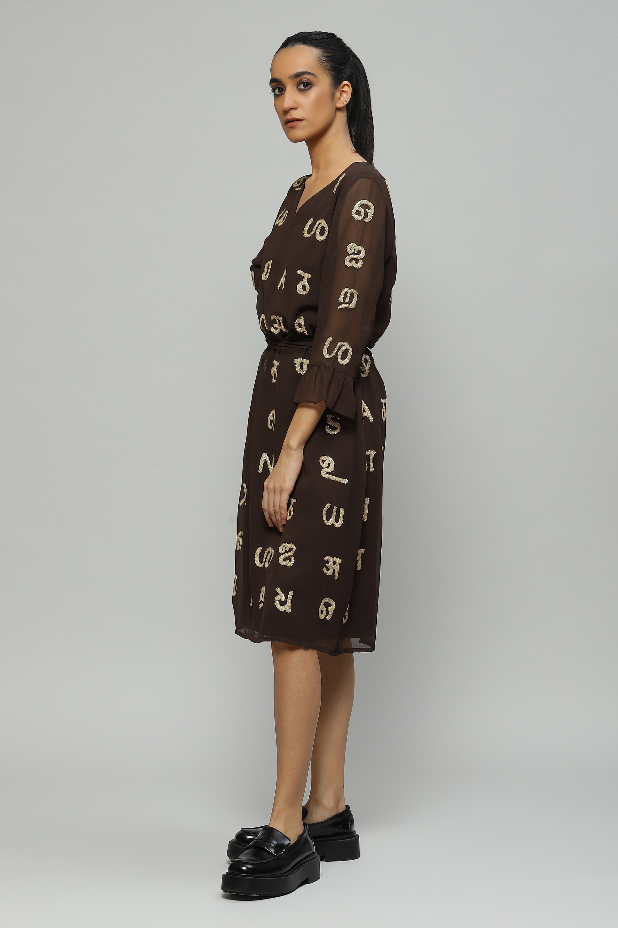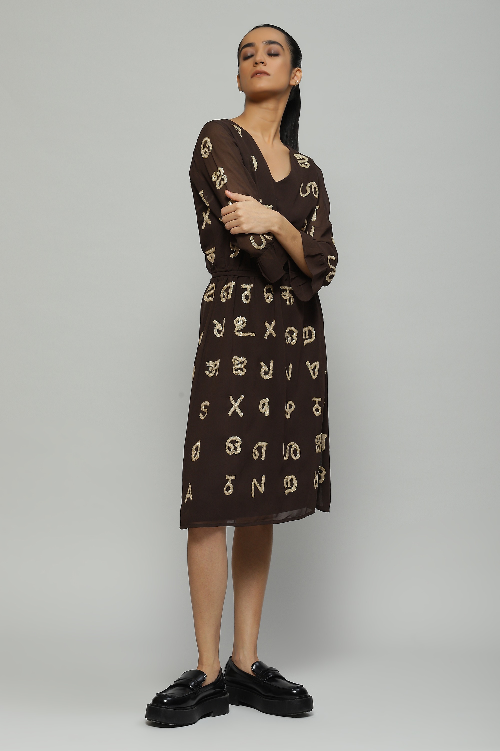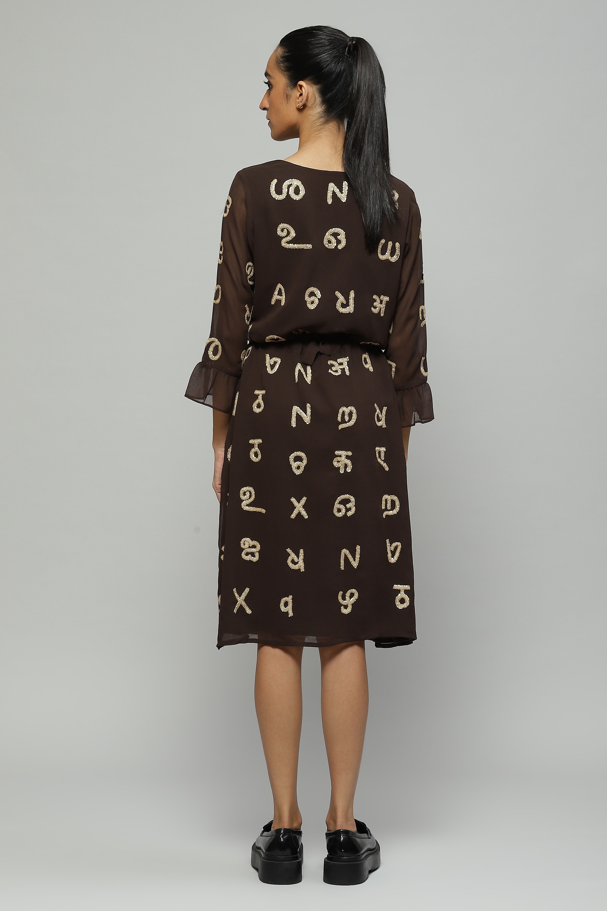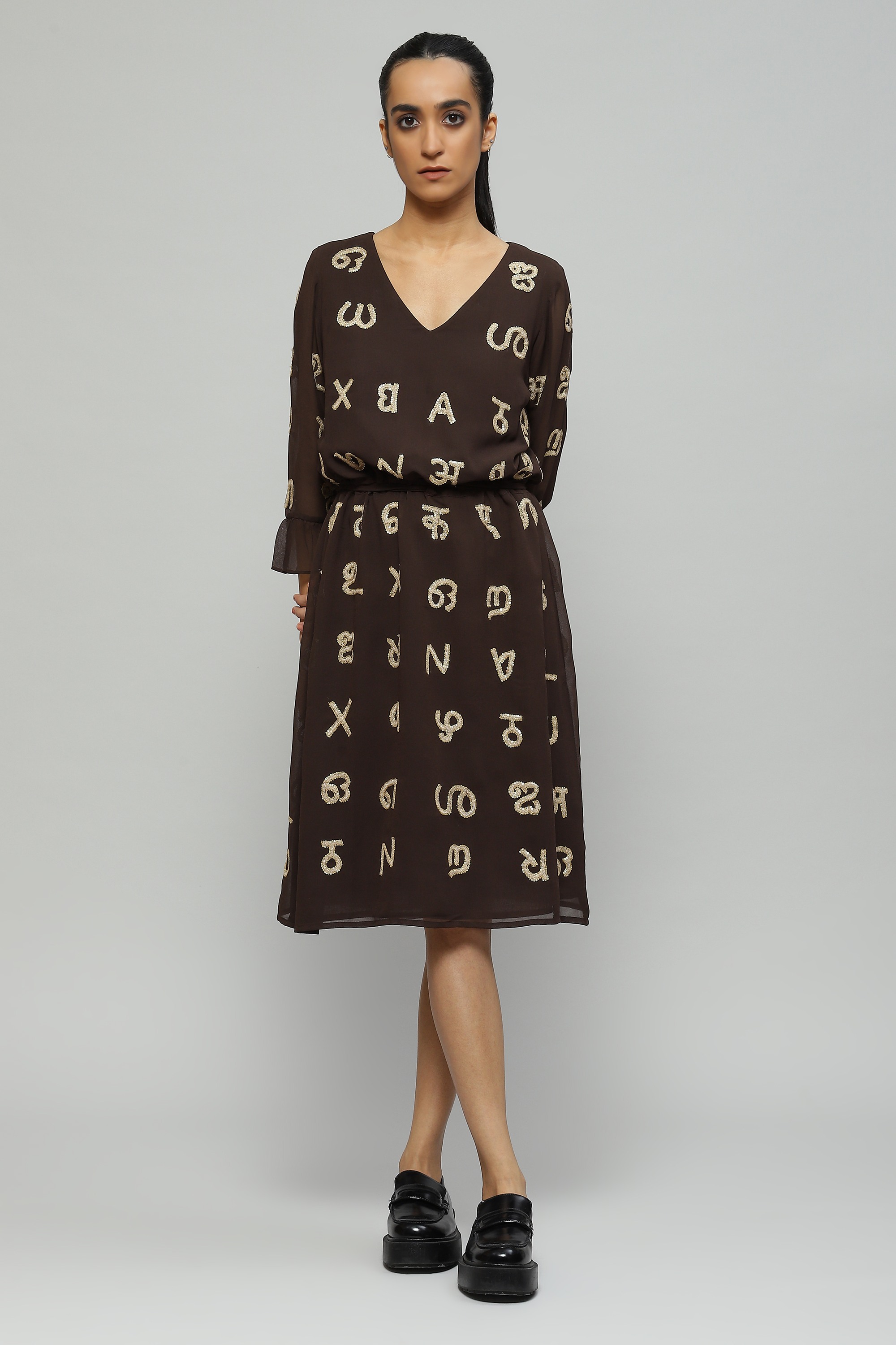 A coffee-toned dress featuring a whimsical take on typography