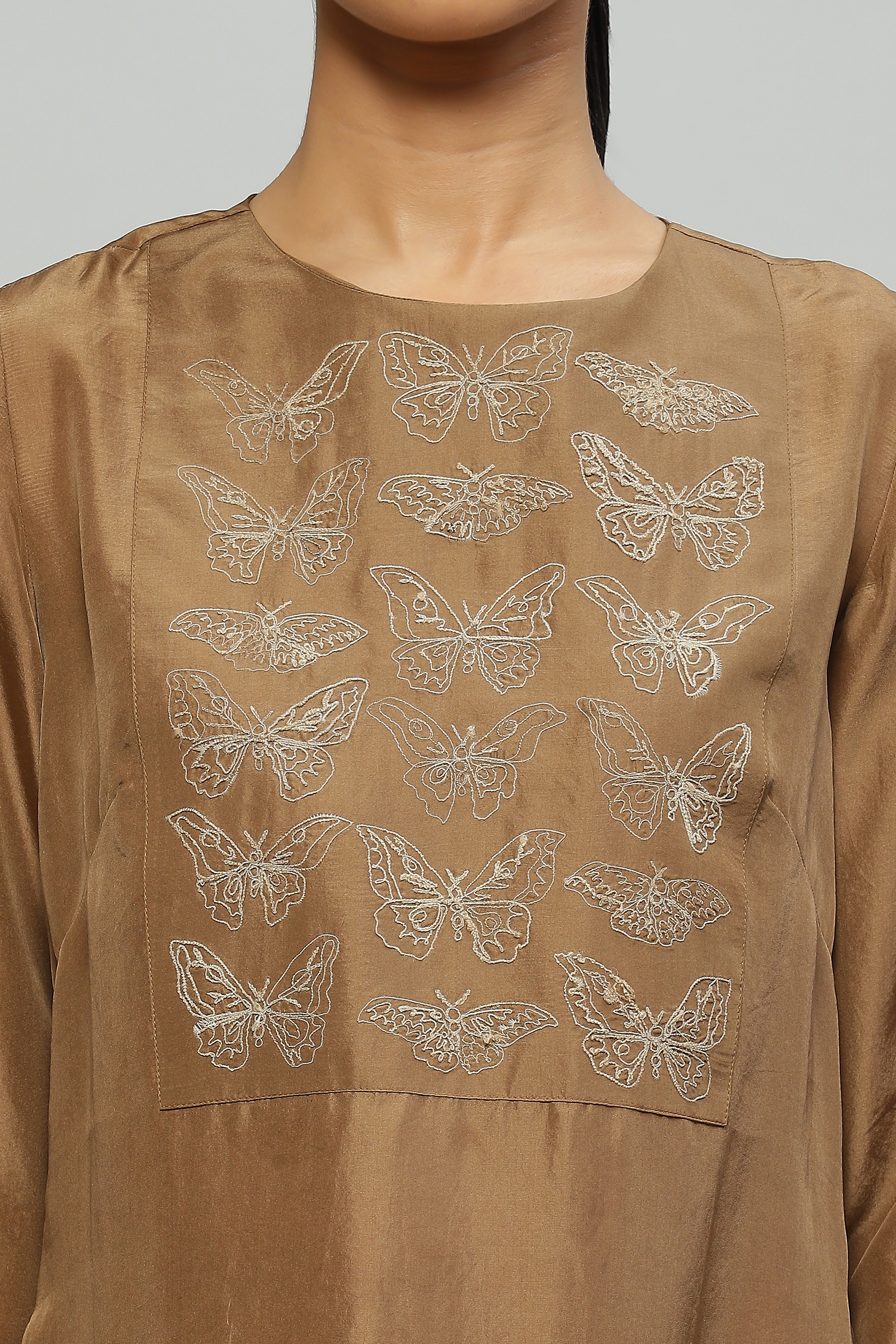 A clove-hued kurta crafted in silk and embroidered with moth motifs in tussar yarn on the bib