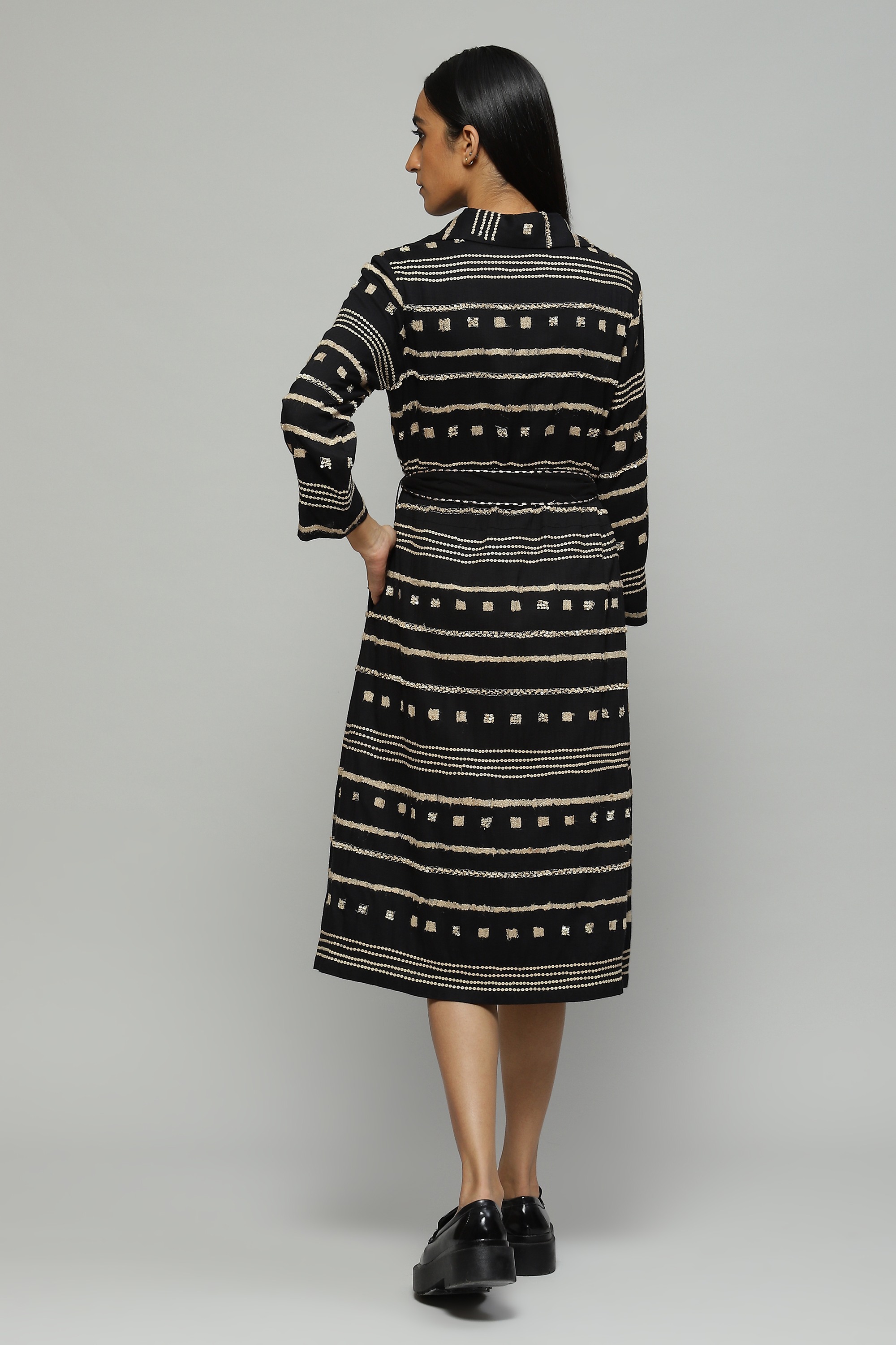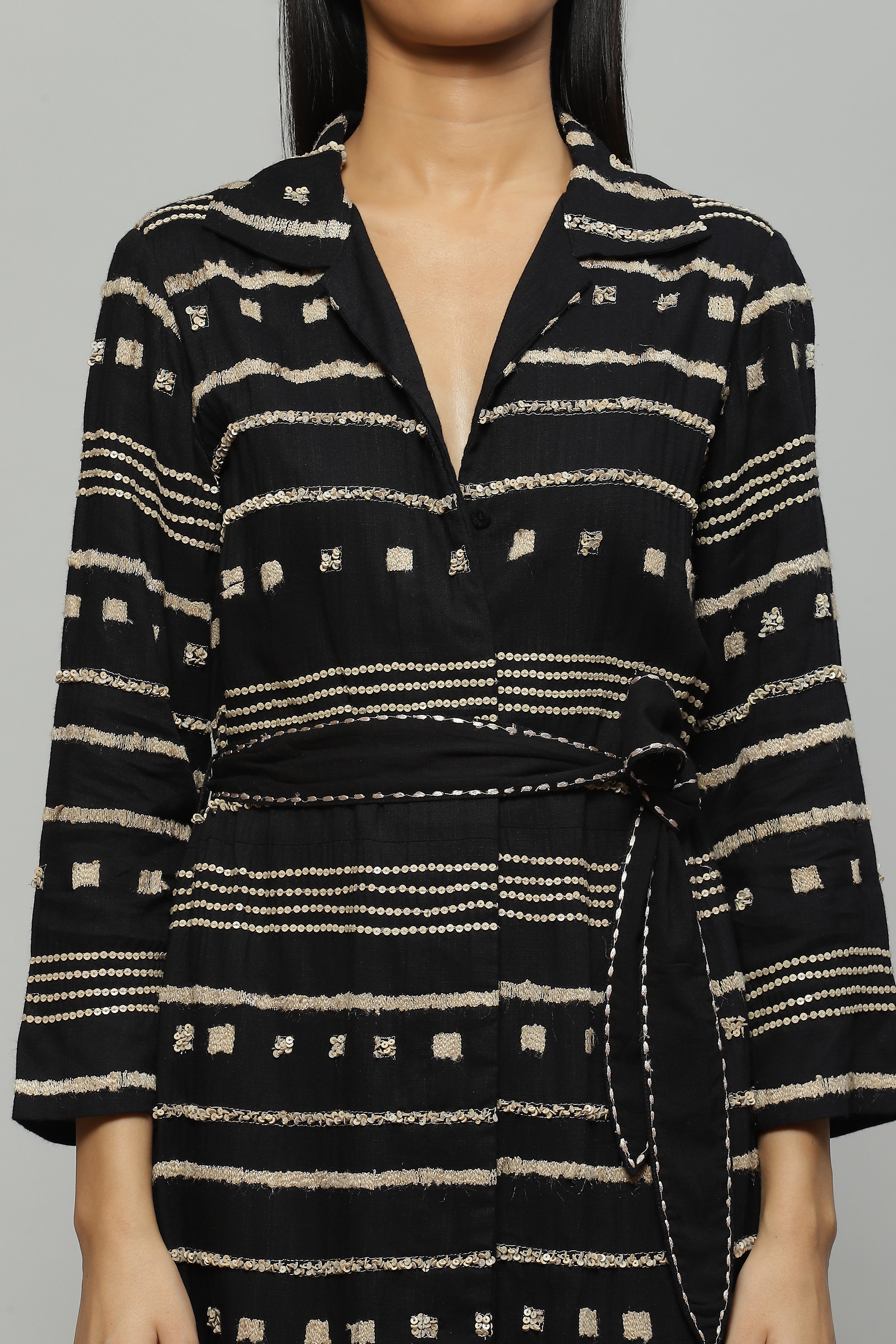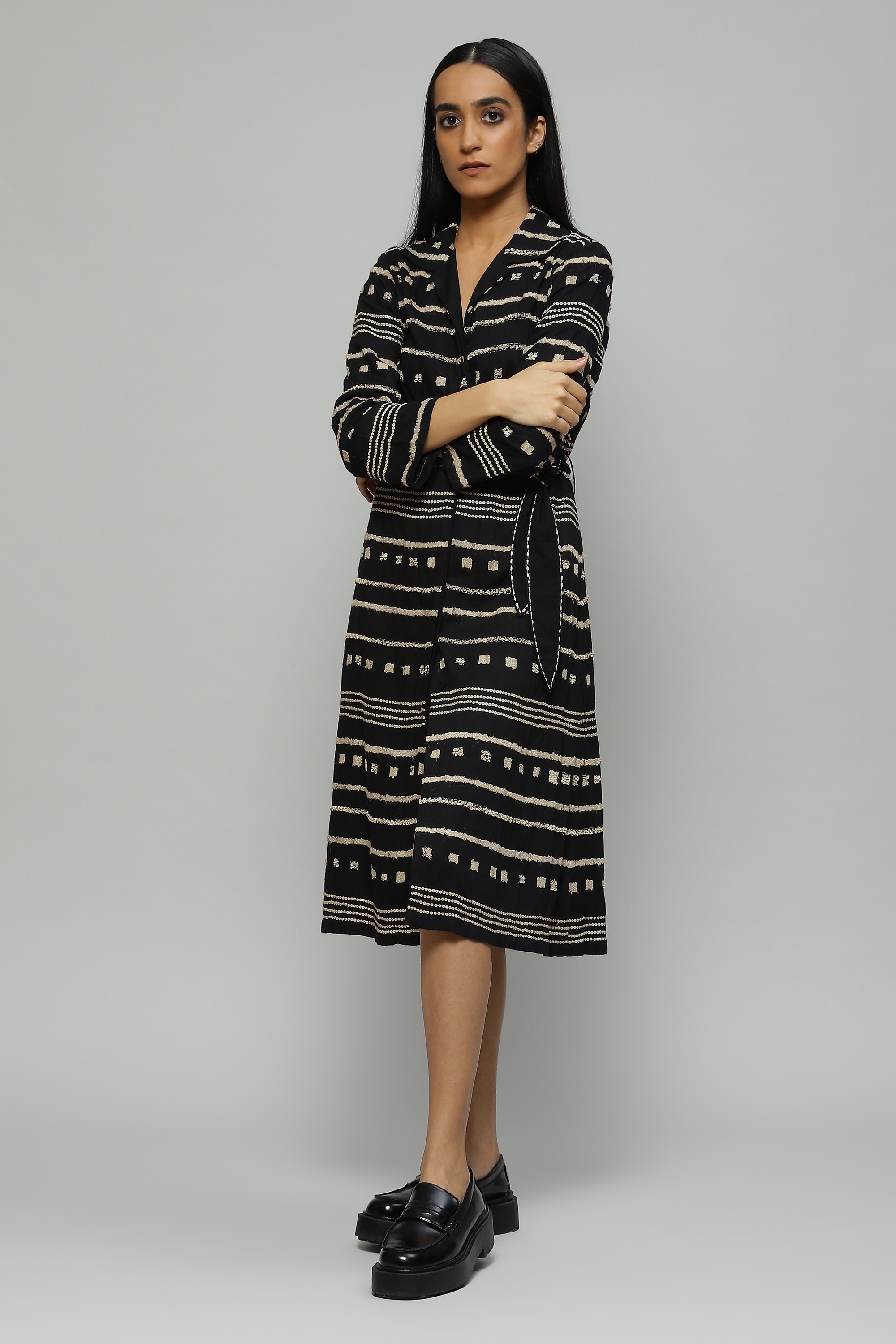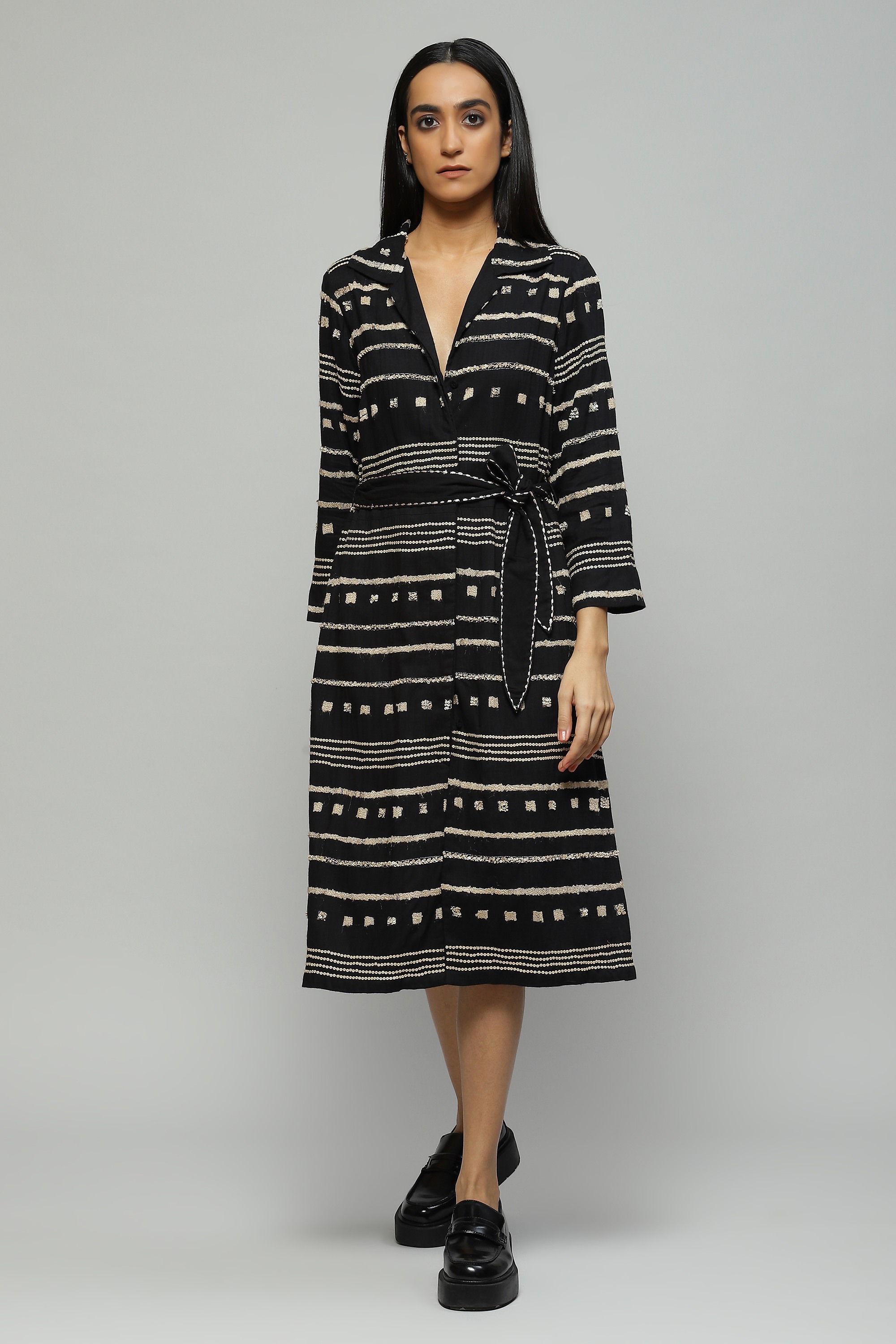 This striped black shirt dress multi-tasks as a jacket and can be cinched at the waist with a sash
