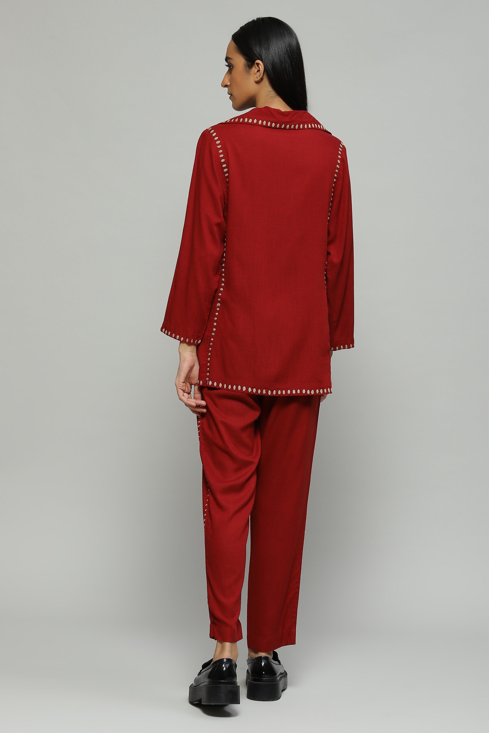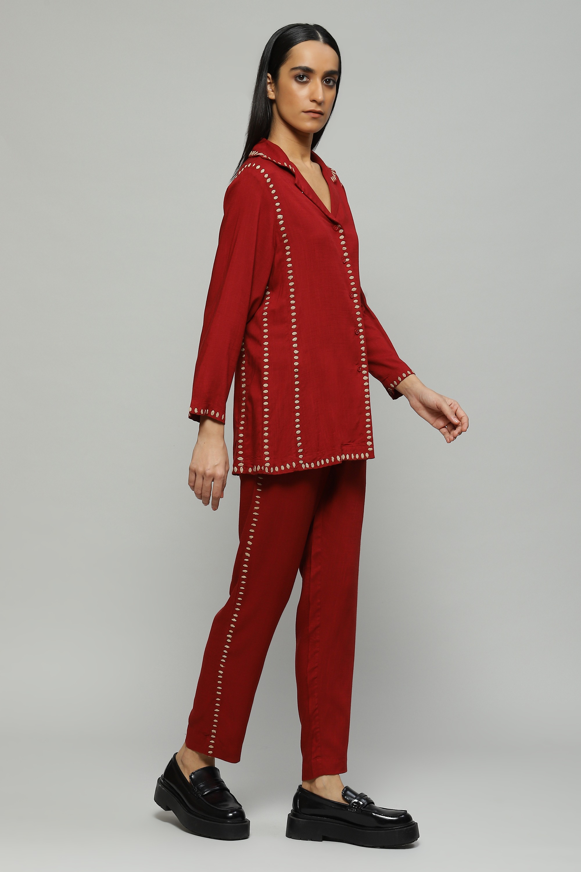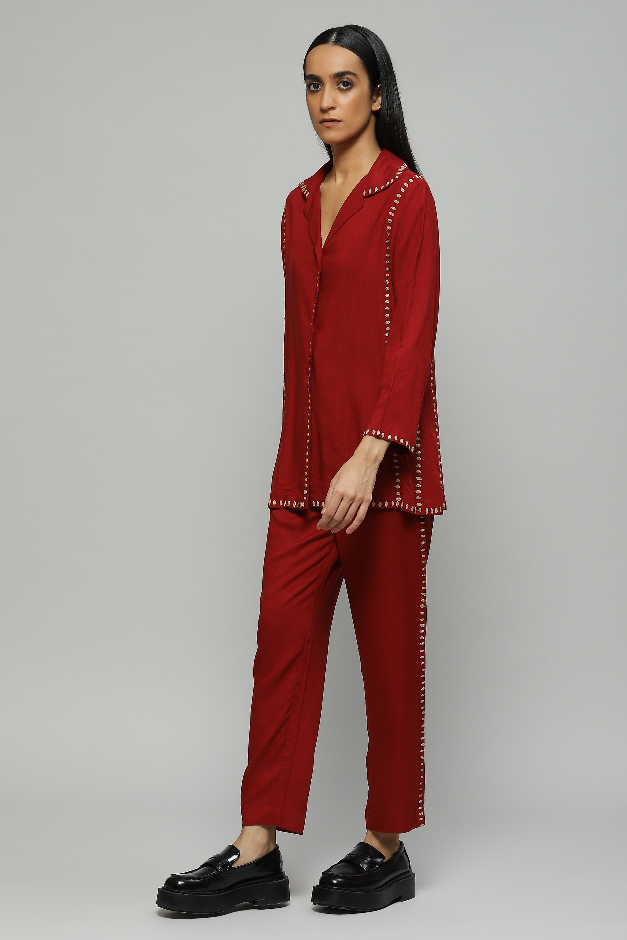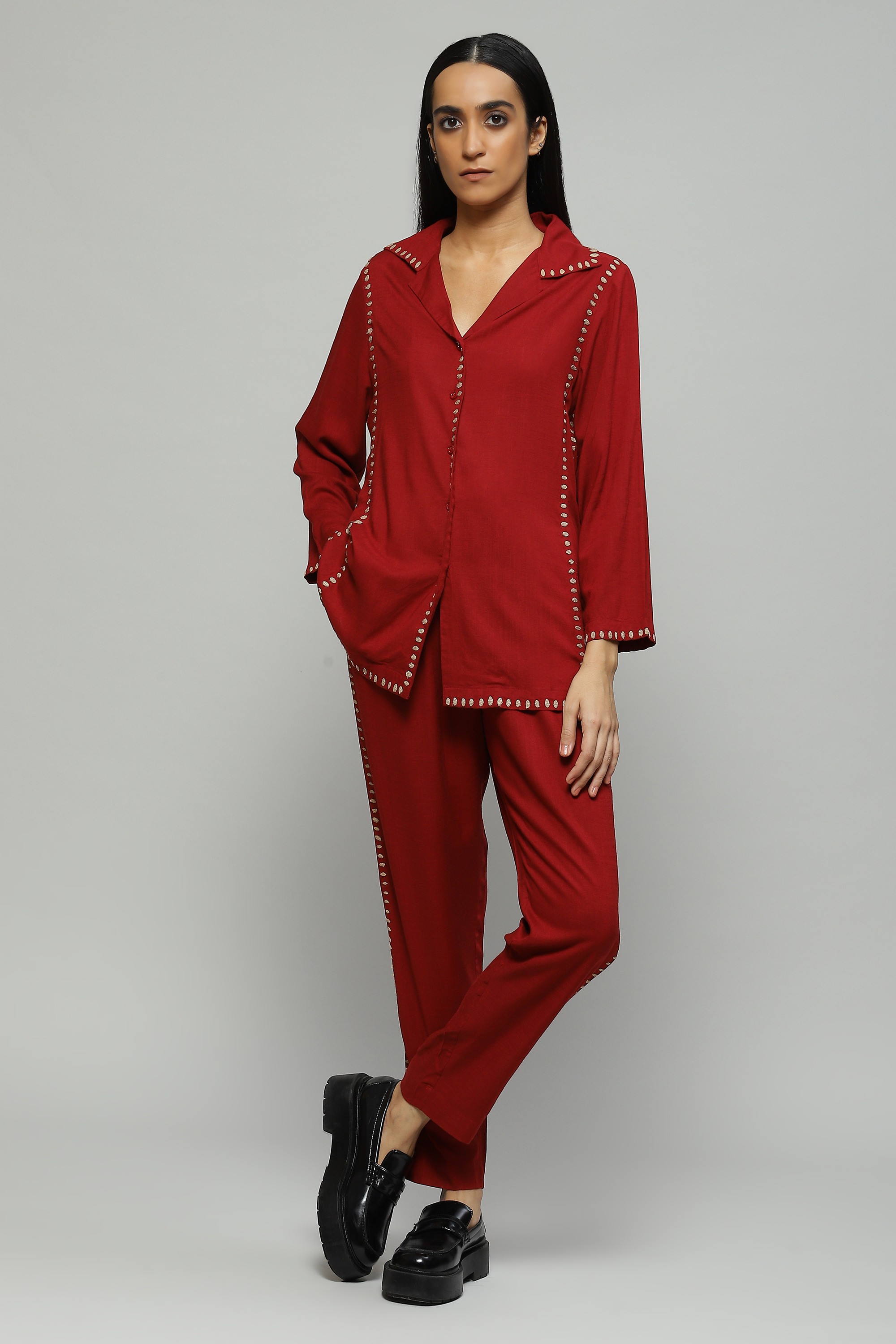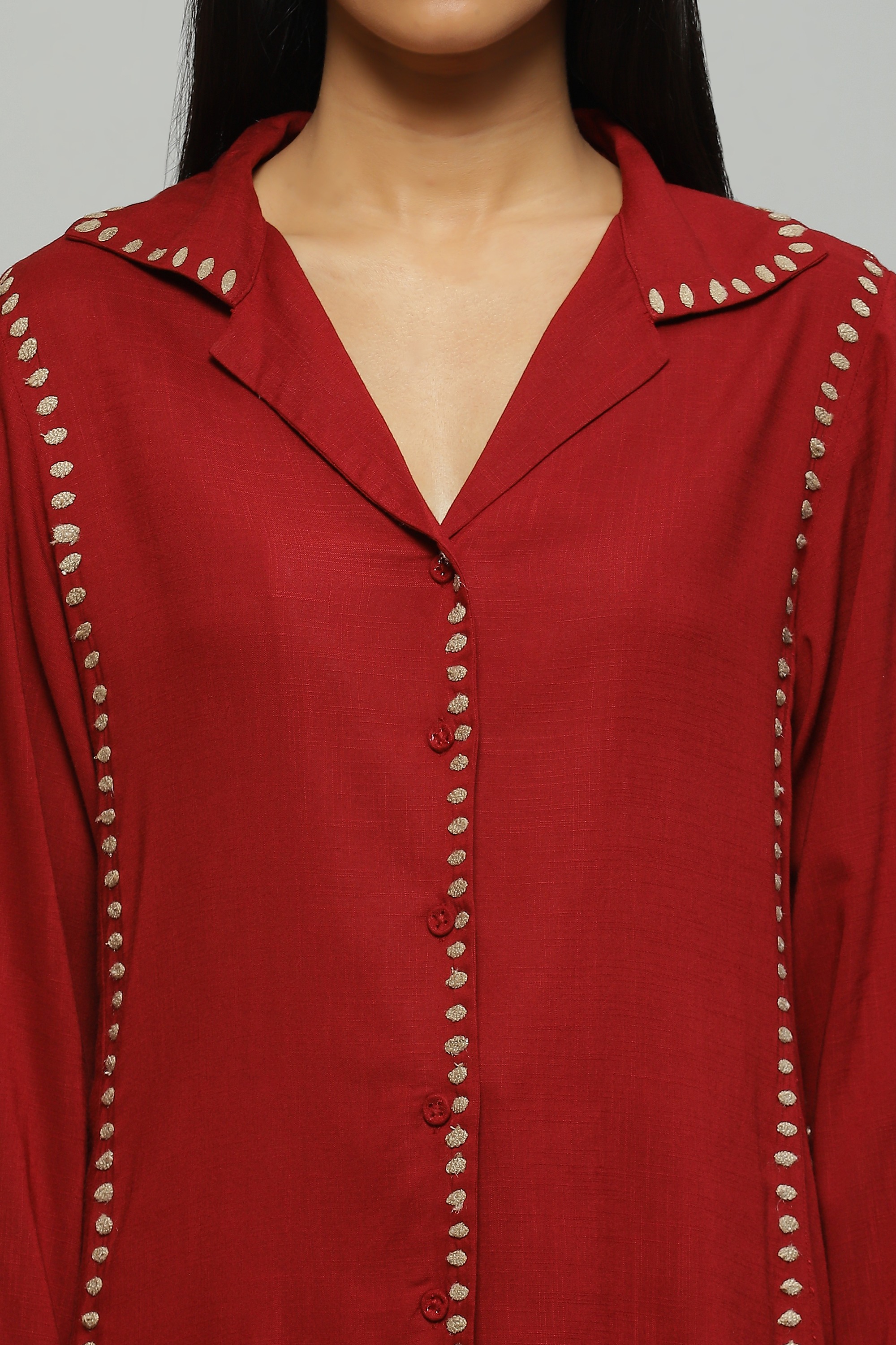 A collared shirt in madder, embellished with stab stitch motifs and blanket stitch embroidery in tussar yarn