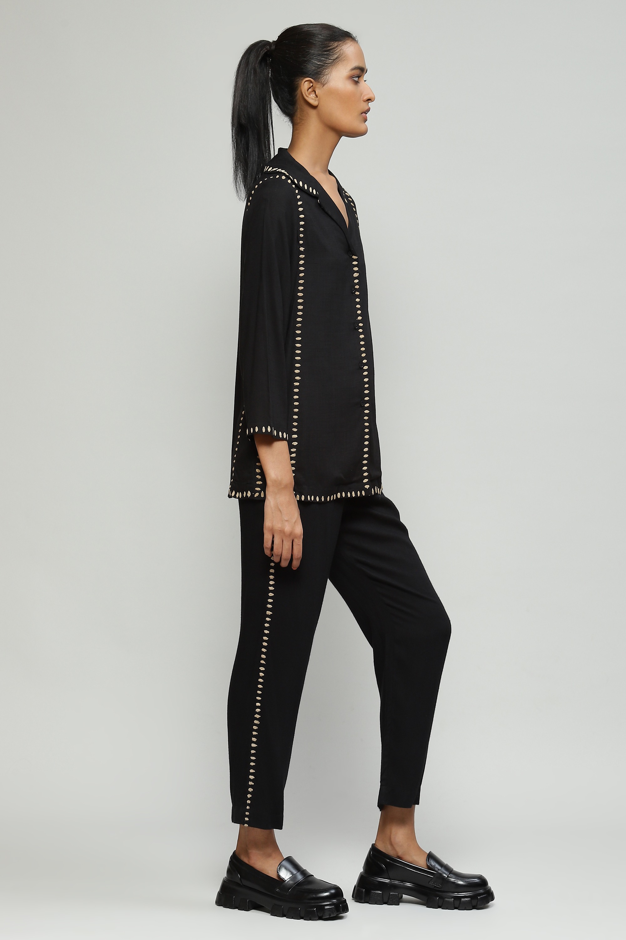 A black collared shirt cut in airy Ecovero slub featuring stab stitch motifs and blanket stitch embroidery in tussar yarn