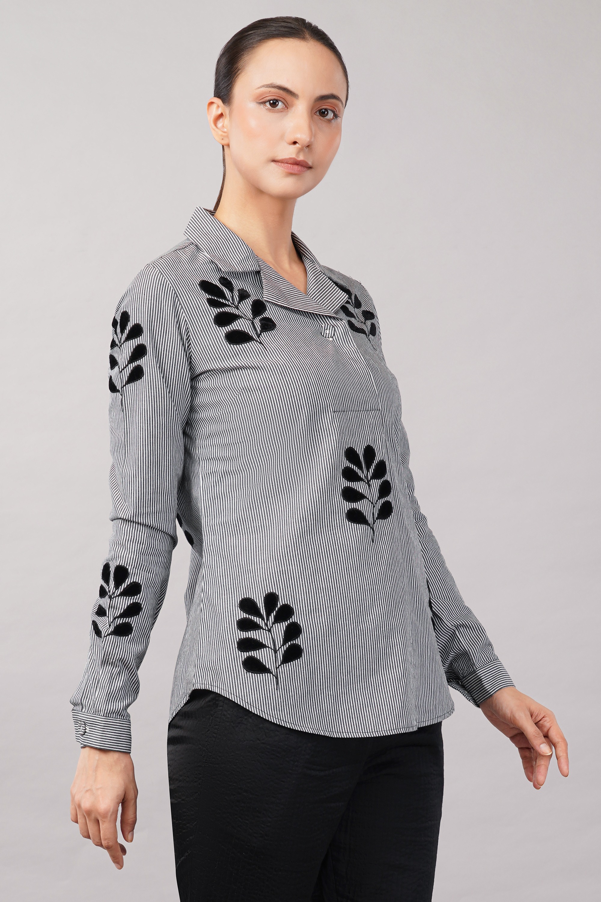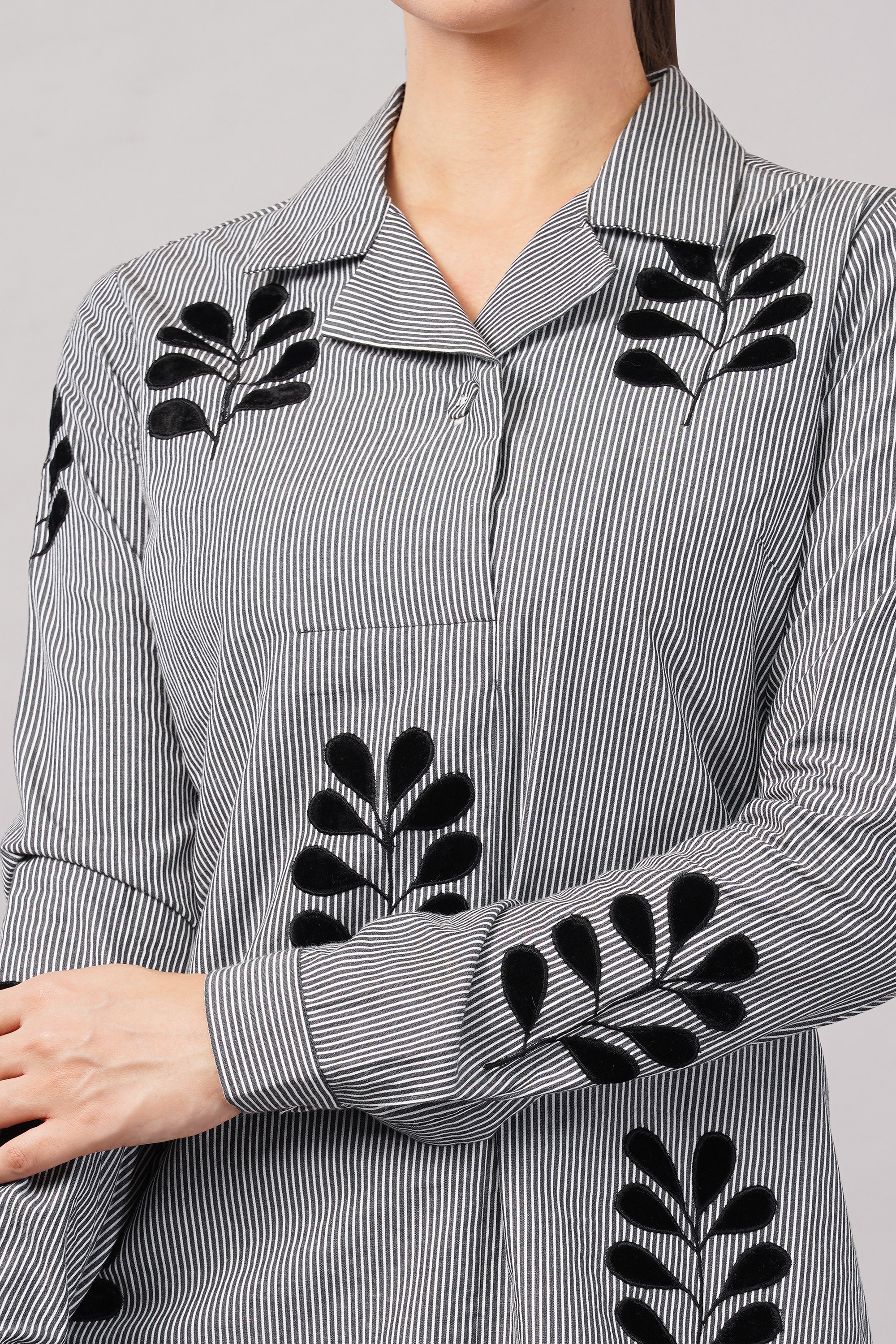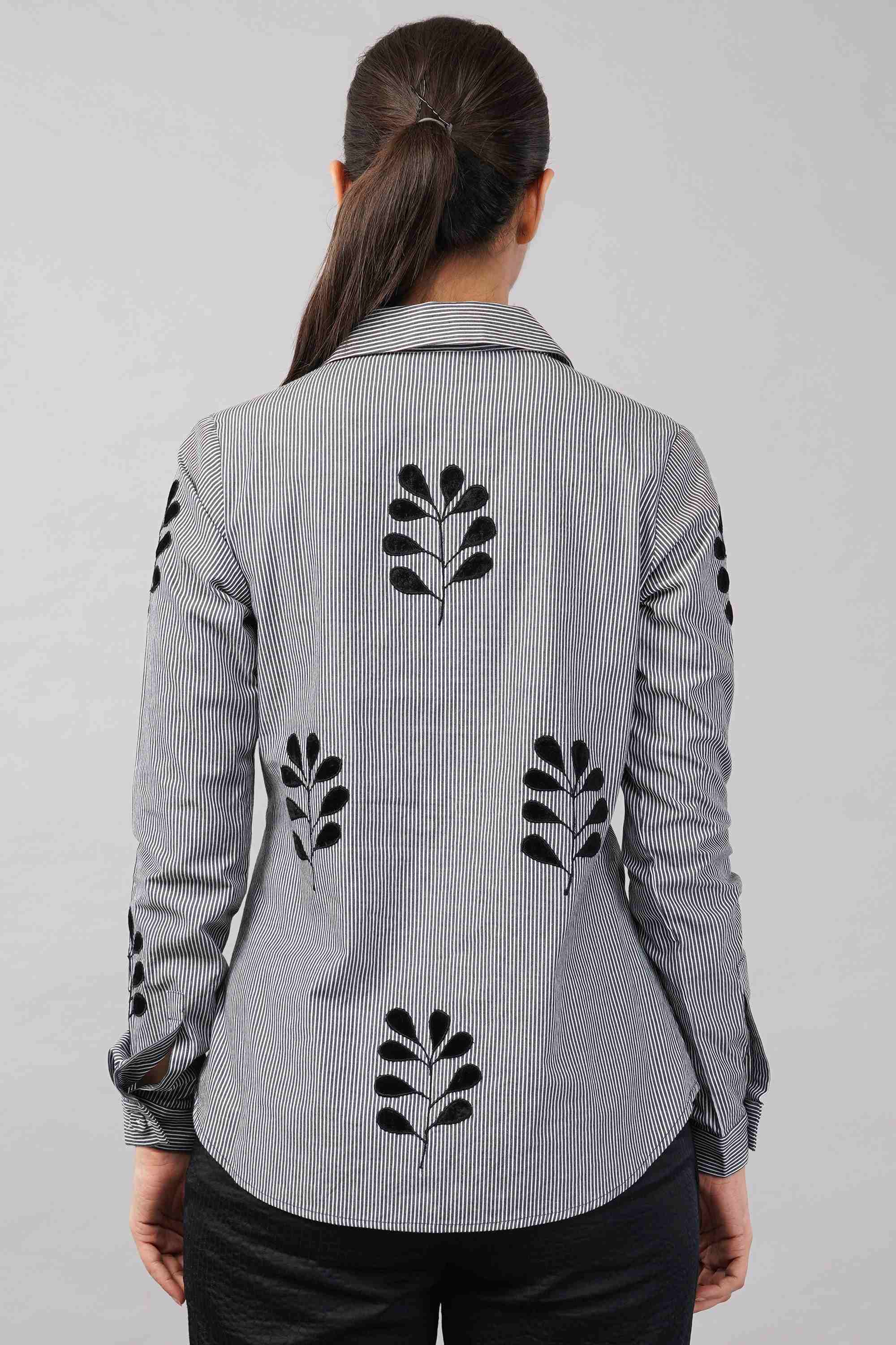 This limited edition piece has been made using a typical menswear striped fabric juxtaposing it with appliqued velvet leaf motifs. Elegant enough for both day and evening wear.