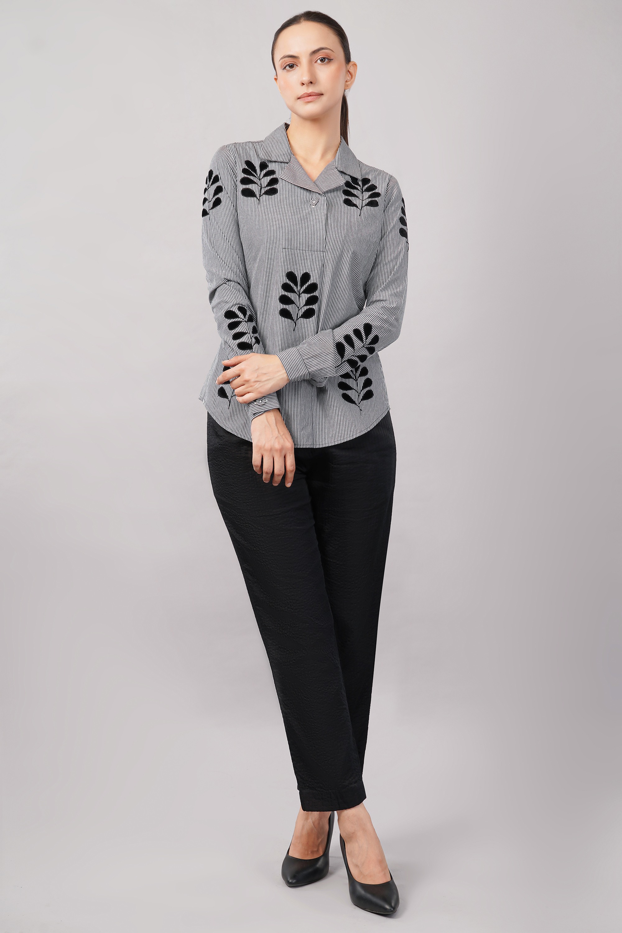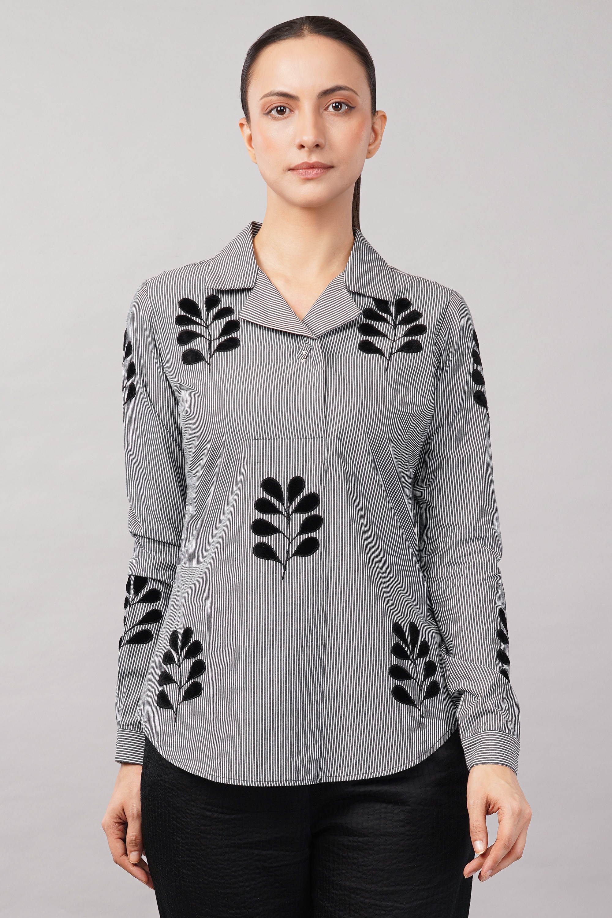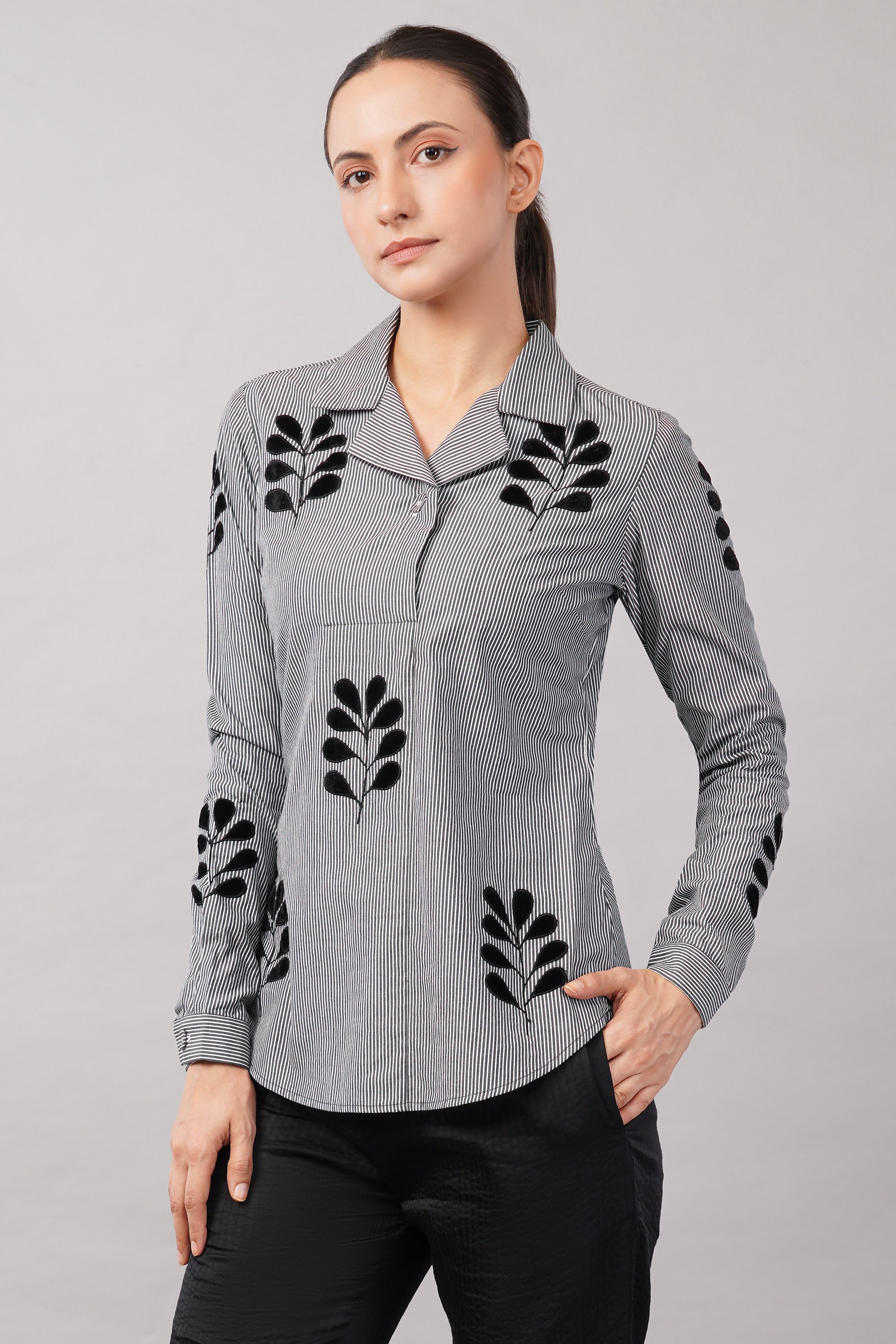 This limited edition piece has been made using a typical menswear striped fabric juxtaposing it with appliqued velvet leaf motifs. Elegant enough for both day and evening wear.
