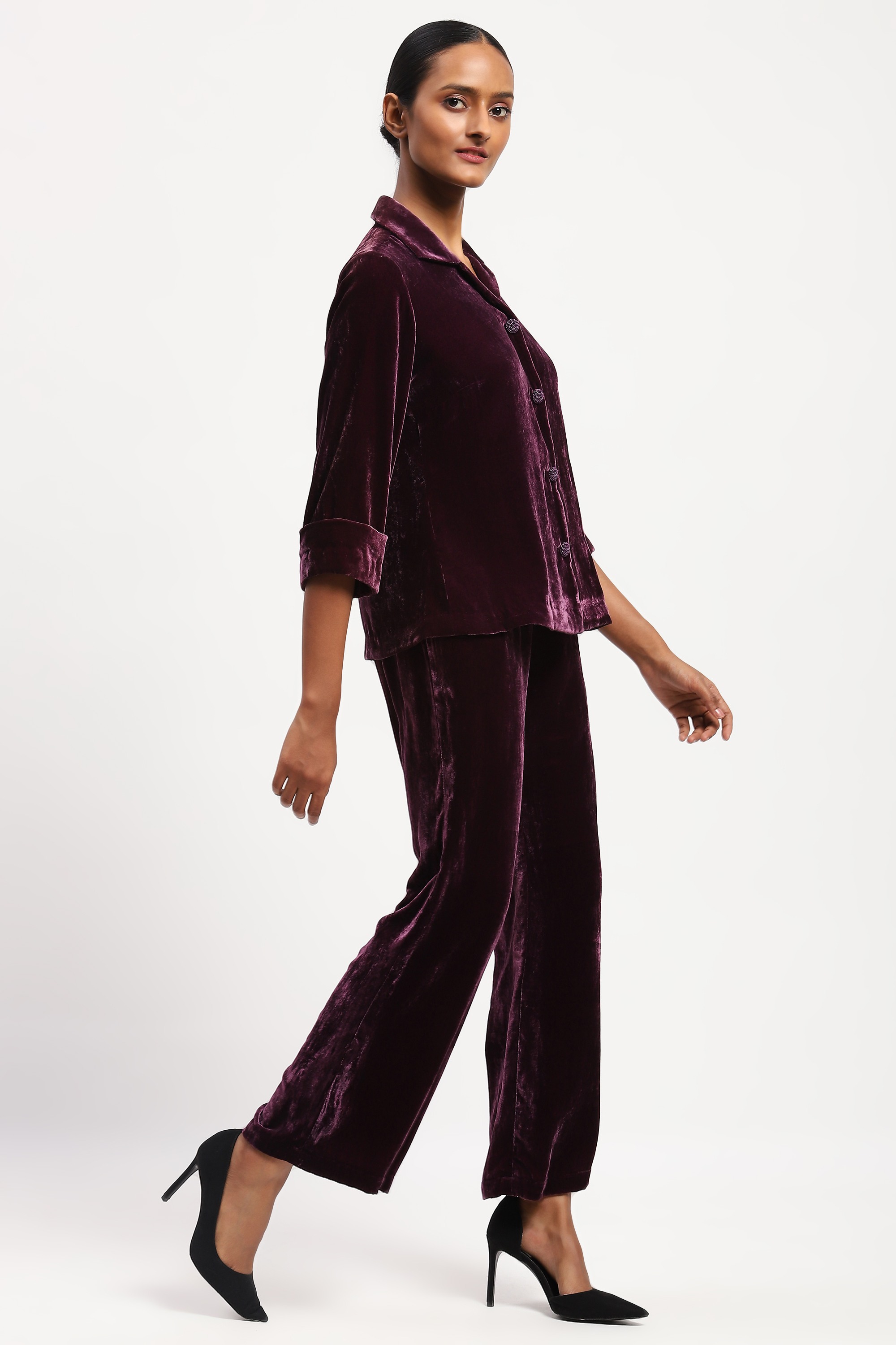Crafted in silk velvet, this aubergine shirt is appliqued with organza.
