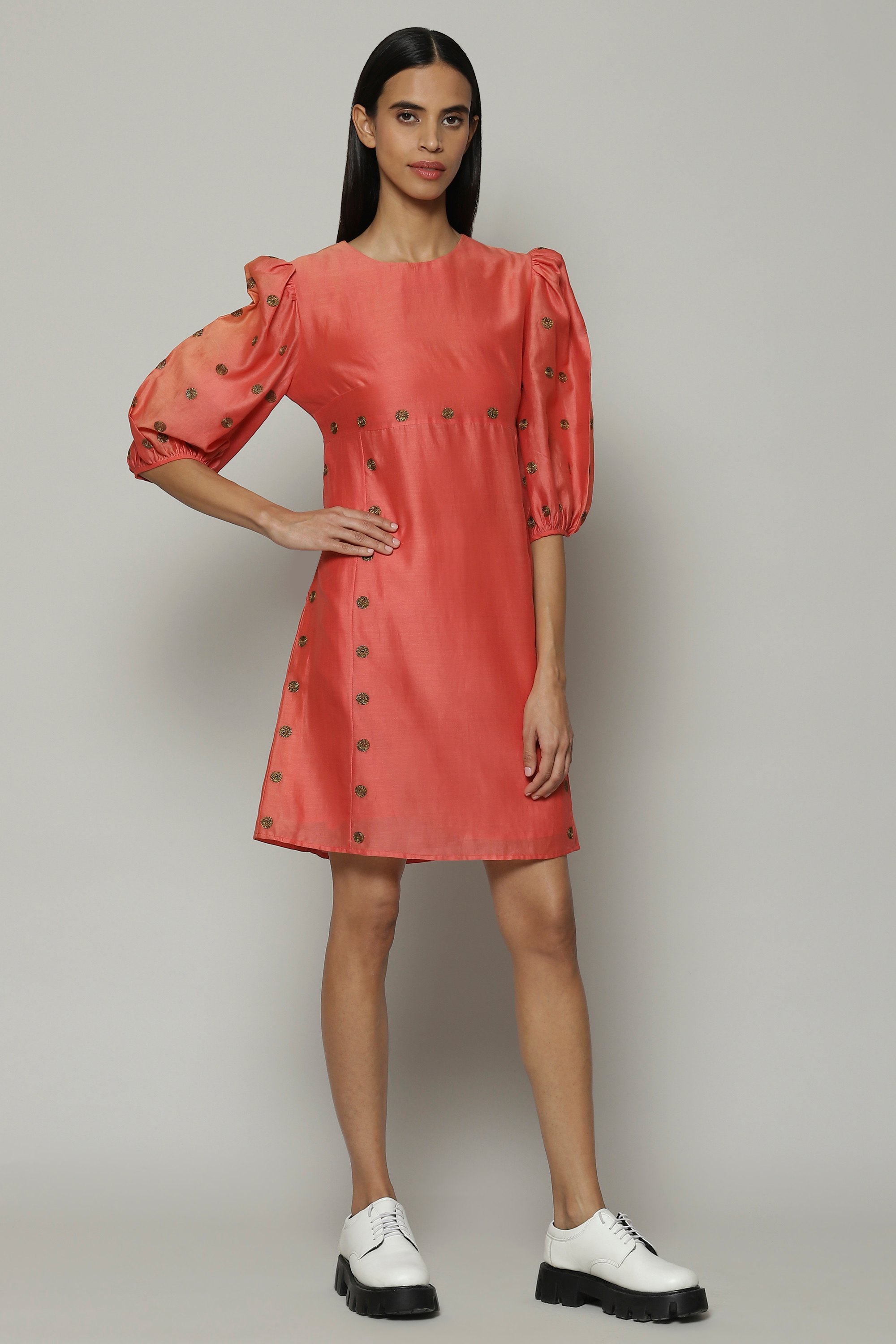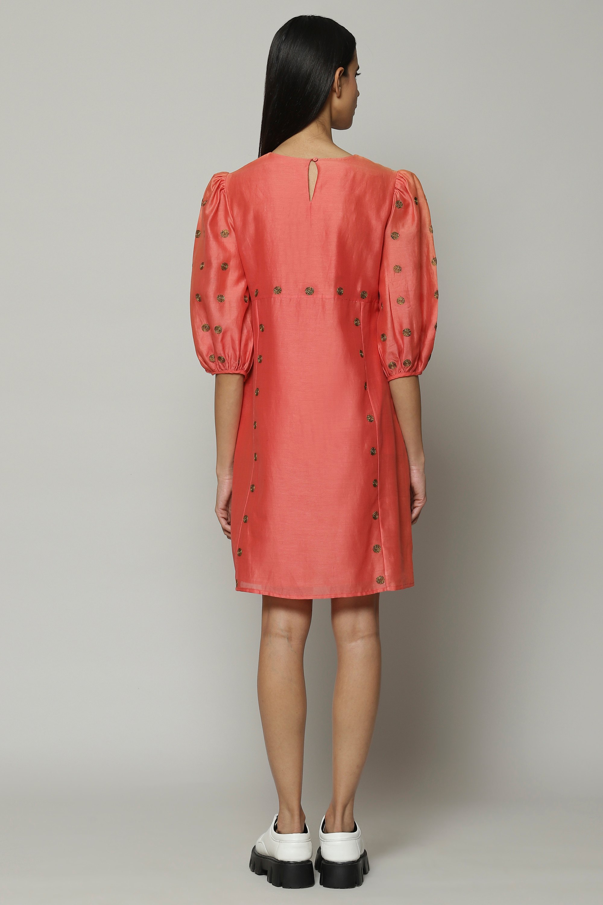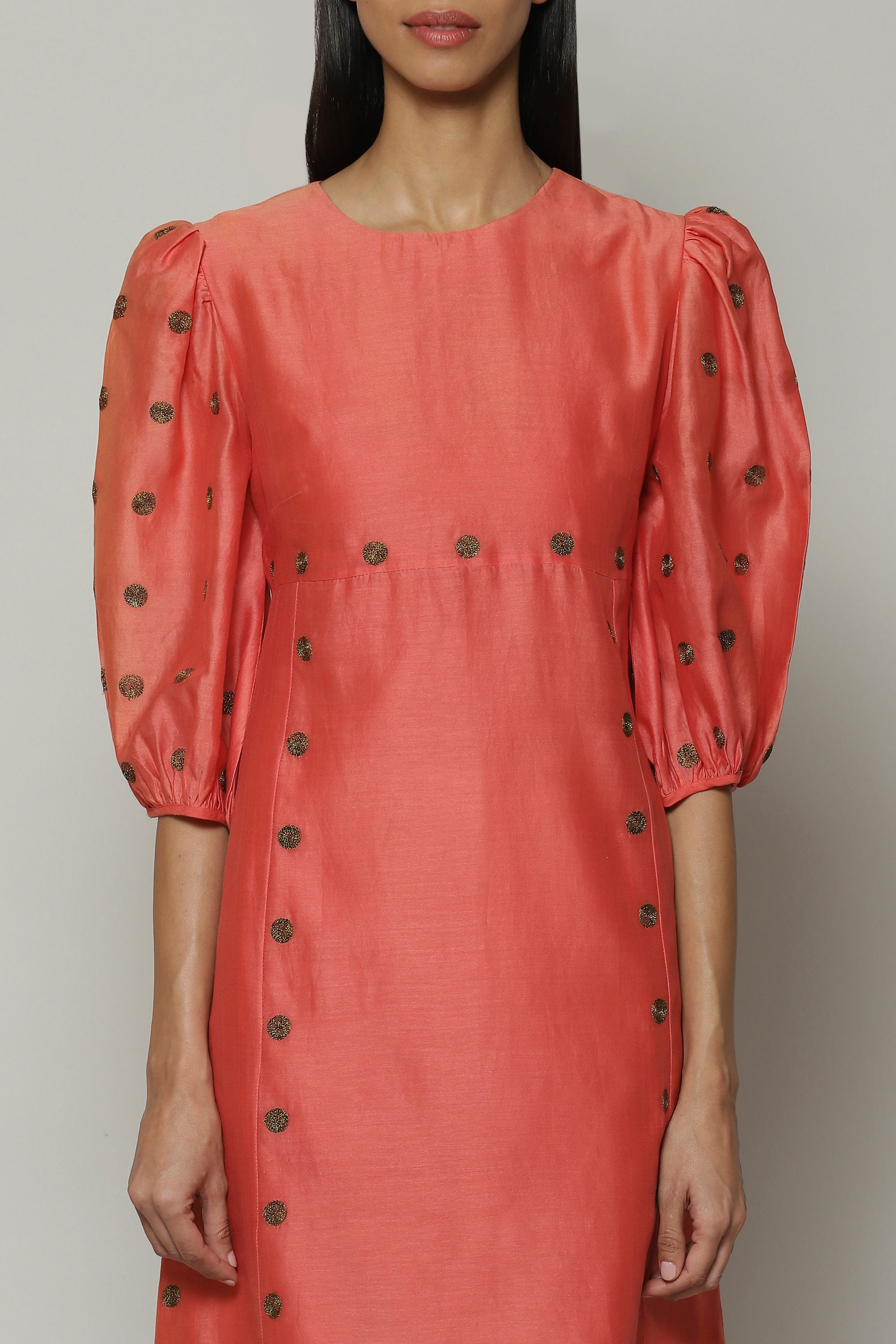 Dreams of dots and lines, play out on a pink top. This piece is crafted from lightweight Chanderi and embroidered with silk zari. An easy choice for any ocassion.